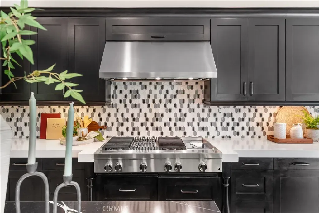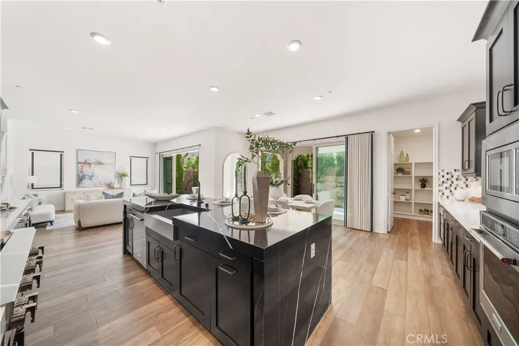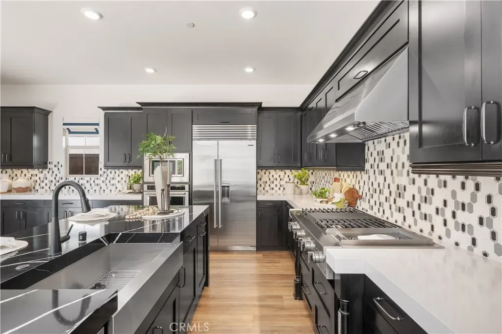 The chef’s kitchen serves as the centerpiece of the home, featuring a striking waterfall-edge island, upgraded quartz countertops with enhanced edge detail, a full designer backsplash, and maple cabinetry with upgraded hardware and soft-close drawers. A premium 42-inch built-in Sub-Zero refrigerator anchors the space, while the open layout seamlessly connects to the dining and living areas—ideal for both everyday living and entertaining.