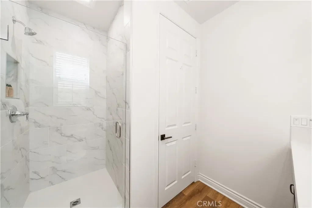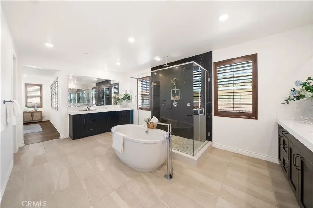 The primary suite offers a spa-inspired bathroom with quartz shower walls, frameless glass enclosure, freestanding soaking tub, quartz countertops, and upgraded tile flooring. Additional bathrooms are tastefully finished with upgraded tile details, reflecting consistent quality throughout.