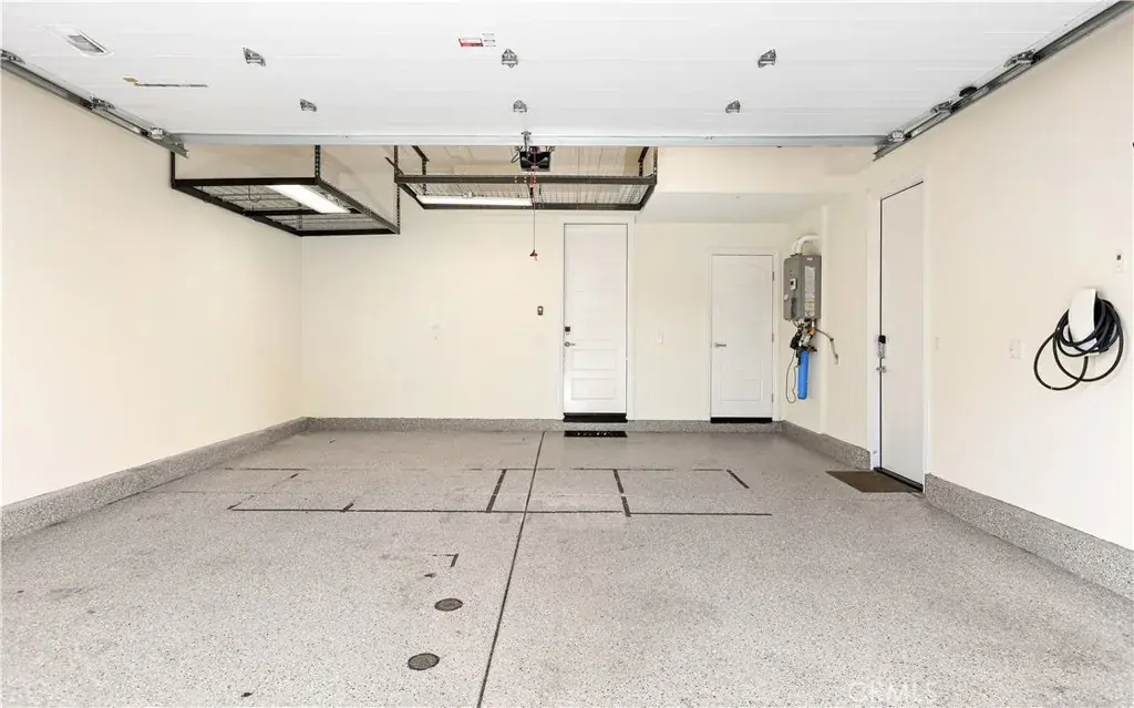 Tesla EV wall charger installed in the epoxy-finished, two-car garage with overhead storage. In-unit laundry and central air conditioning are included.