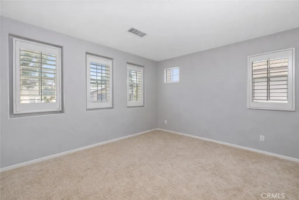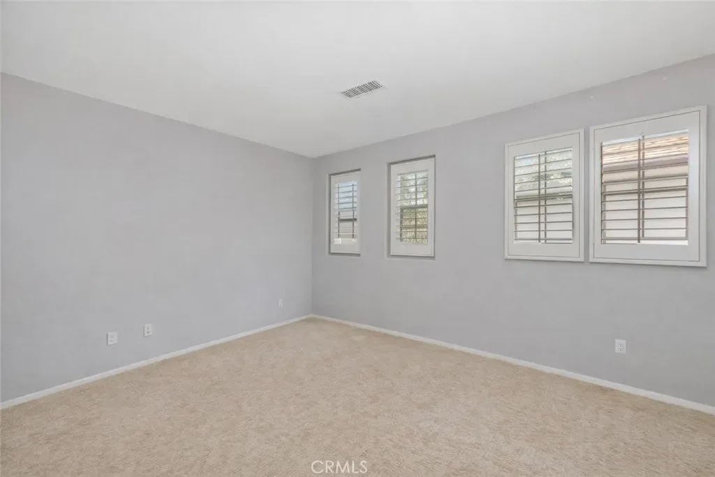 The kitchen is well-appointed with a center island, walk-in pantry, quartz countertops, designer backsplash, and French doors that open to the patio. Upstairs, the spacious primary bedroom includes a retreat area ideal for a home office or sitting space, complete with a custom built-in wall unit. The primary bathroom features a separate soaking tub, walk-in shower, and a walk-in closet. All bedrooms are finished with nearly new plush carpeting.