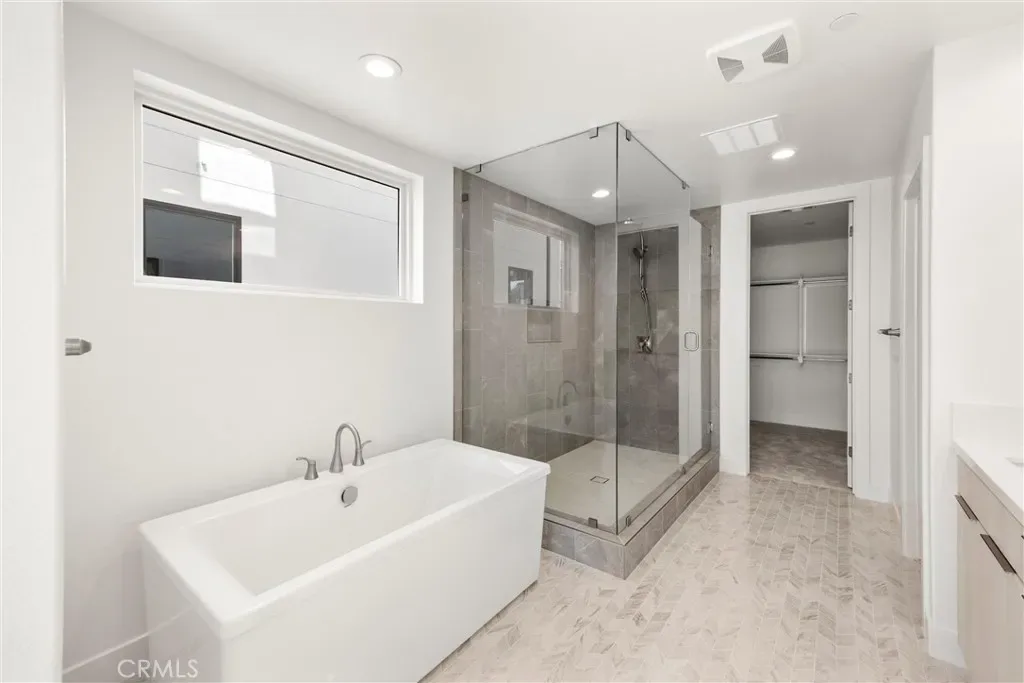 Upstairs, the primary suite offers a serene retreat with a spa-like en-suite bathroom, complete with a freestanding soaking tub and a large glass-enclosed shower. Each additional bedroom is generously sized with access to its own bathroom, providing comfort and privacy for all.