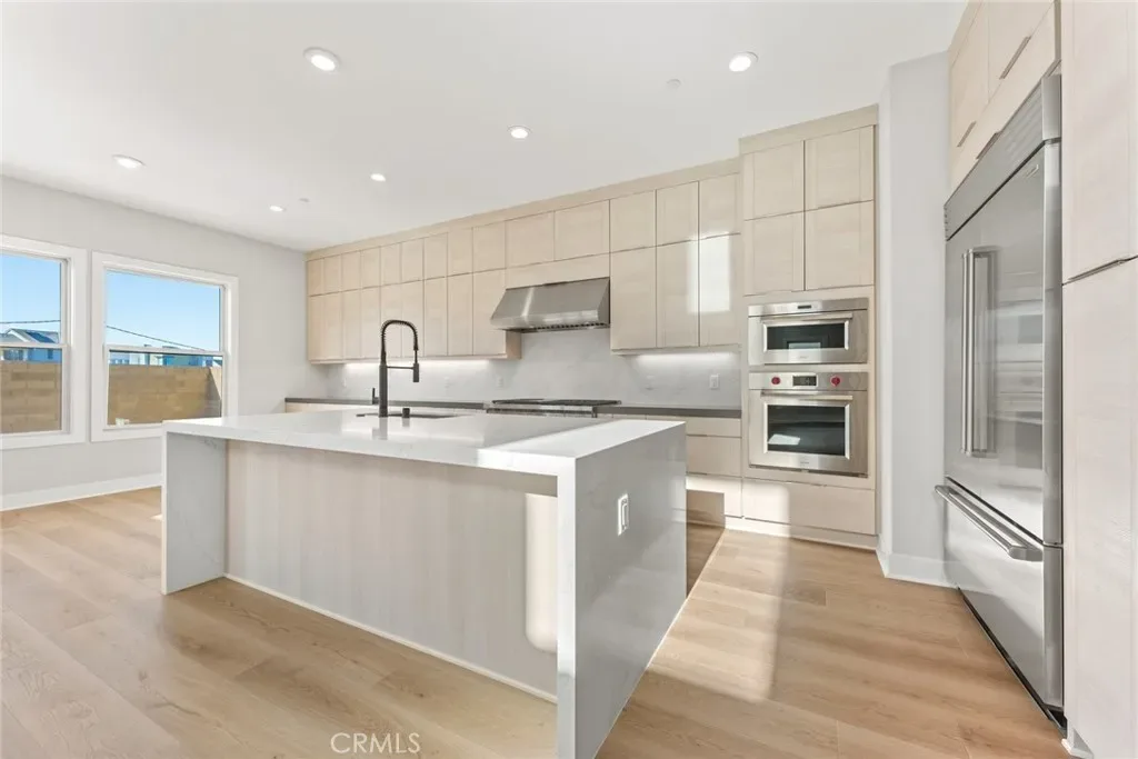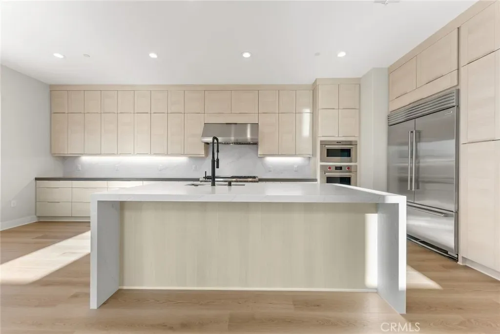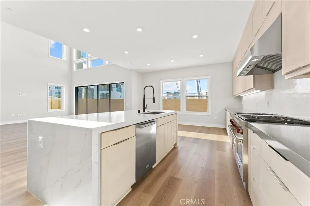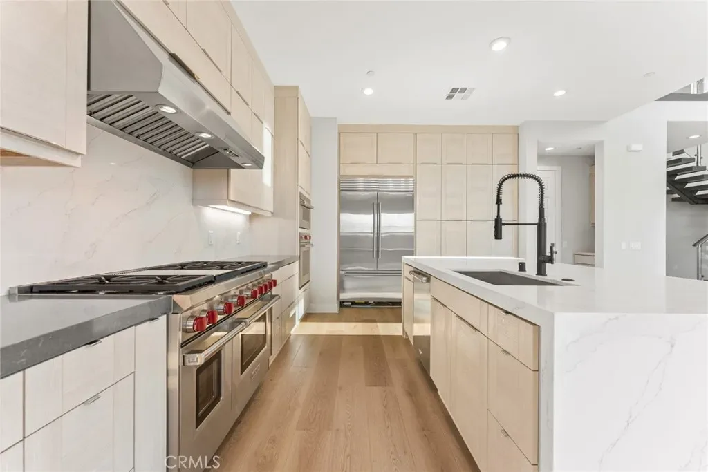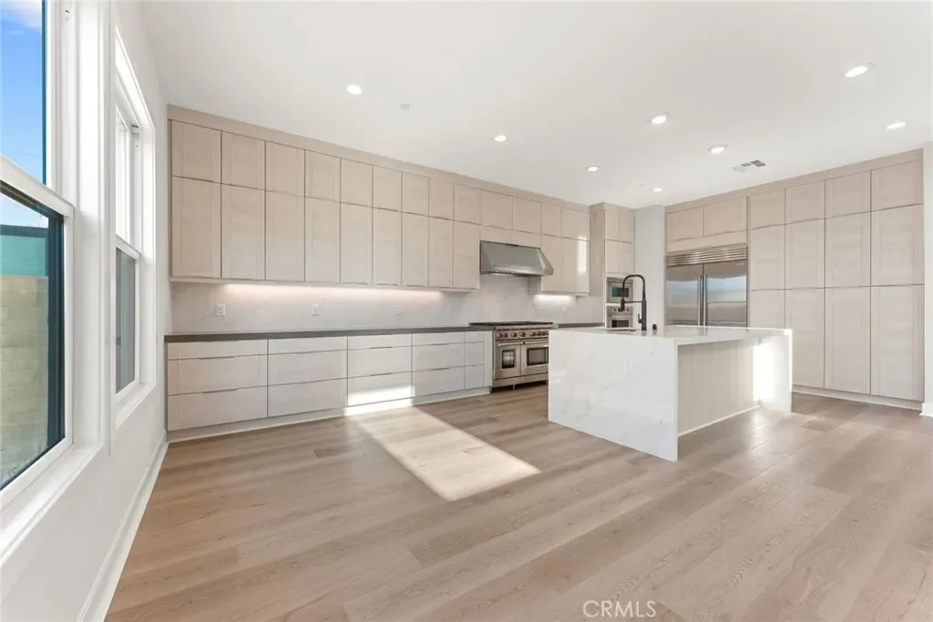 The thoughtfully designed three-level layout features 5 bedrooms and 5 bathrooms, enhanced by extensive builder upgrades and refined designer finishes throughout. The main level is highlighted by a dramatic two-story great room with an open-concept living, dining, and gourmet kitchen layout. The kitchen includes a spacious center island, quartz countertops, upgraded cabinetry, and carefully selected finishes. A multi-slide stackable glass door provides seamless indoor-outdoor flow.