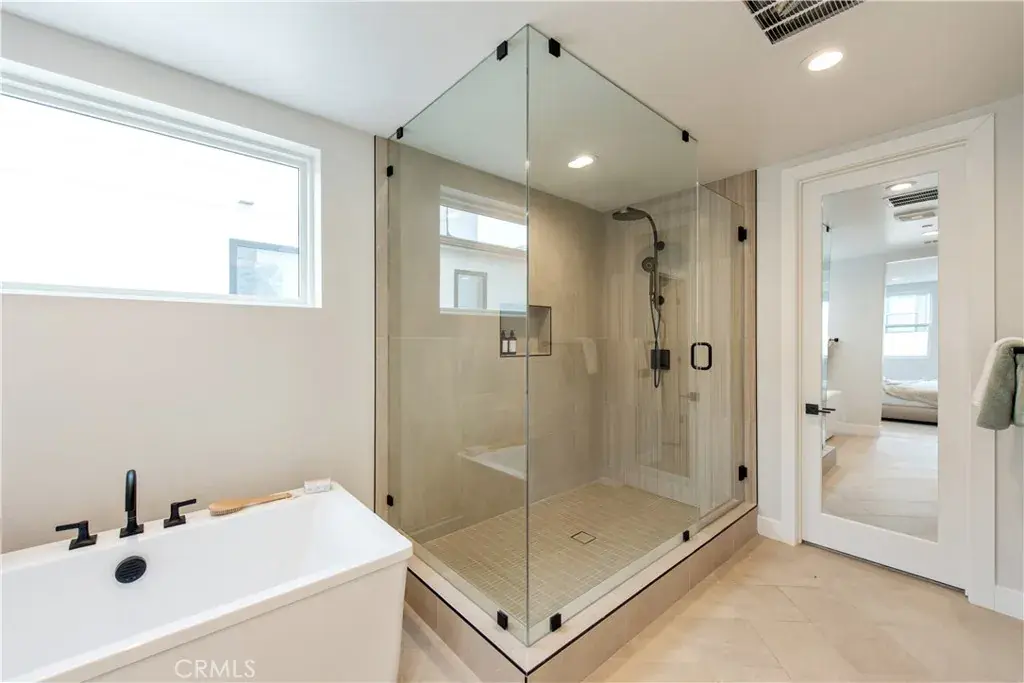 The primary suite is located on the second level and showcases a spa-inspired bathroom with custom curated tile, a freestanding soaking tub, and an oversized glass-enclosed shower with porcelain tile walls. Additional highlights include a gourmet chef’s kitchen with WOLF appliances, a Sub-Zero refrigerator, and designer-selected finishes throughout.