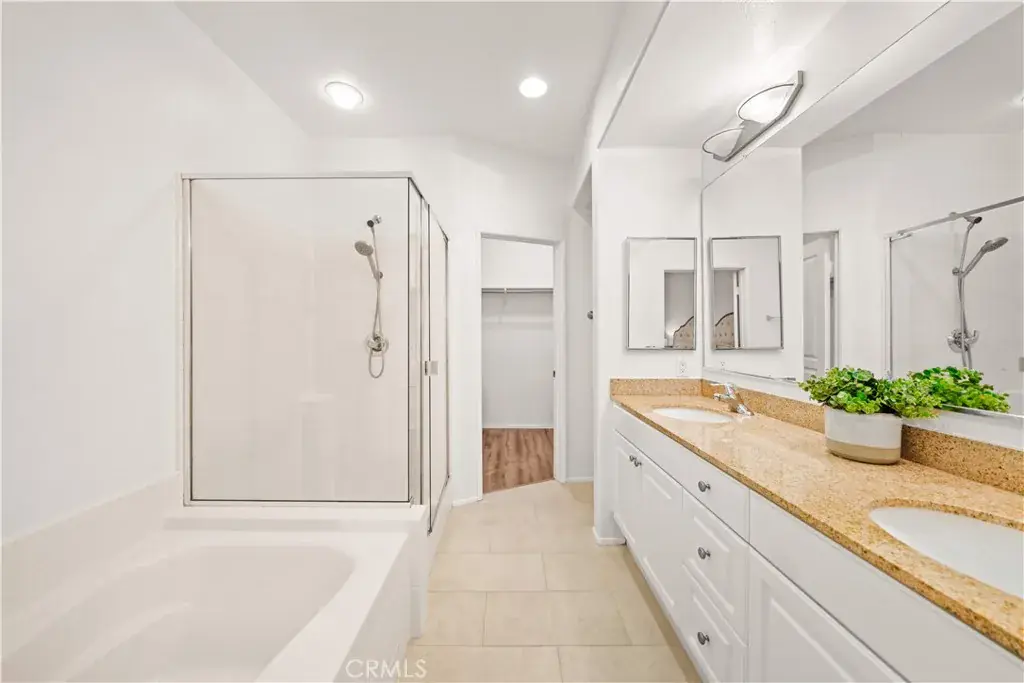 Downstairs, the private bedroom level includes a generous primary suite with a large walk-in closet, dual sinks, soaking tub, and separate shower, along with a comfortable secondary bedroom. Both bedrooms feature brand-new carpeting, reinforcing the home’s freshly updated, turn-key condition. An additional full bathroom and linen closet provide ample storage.