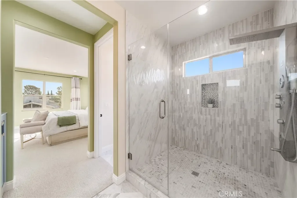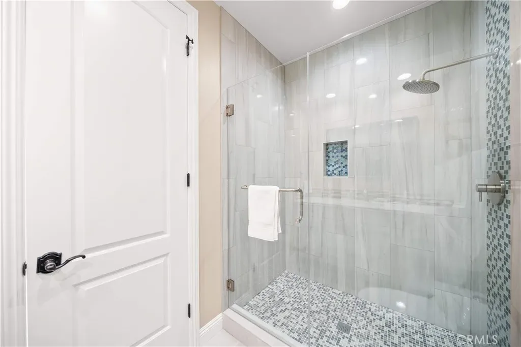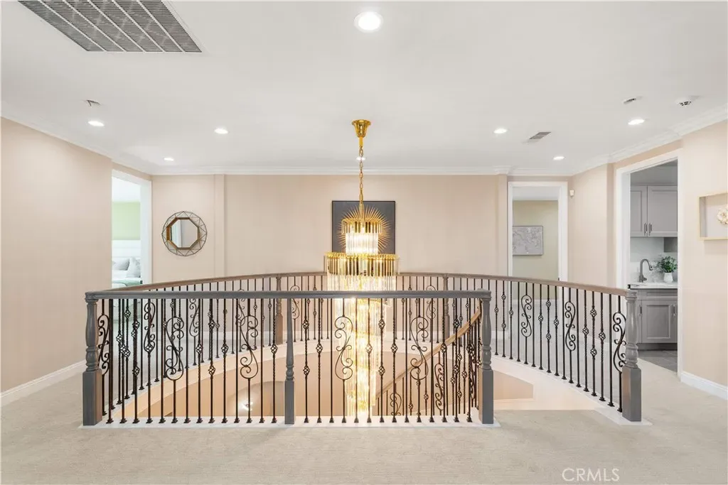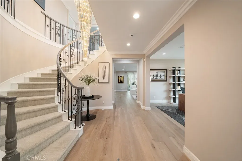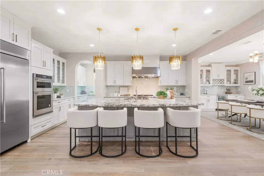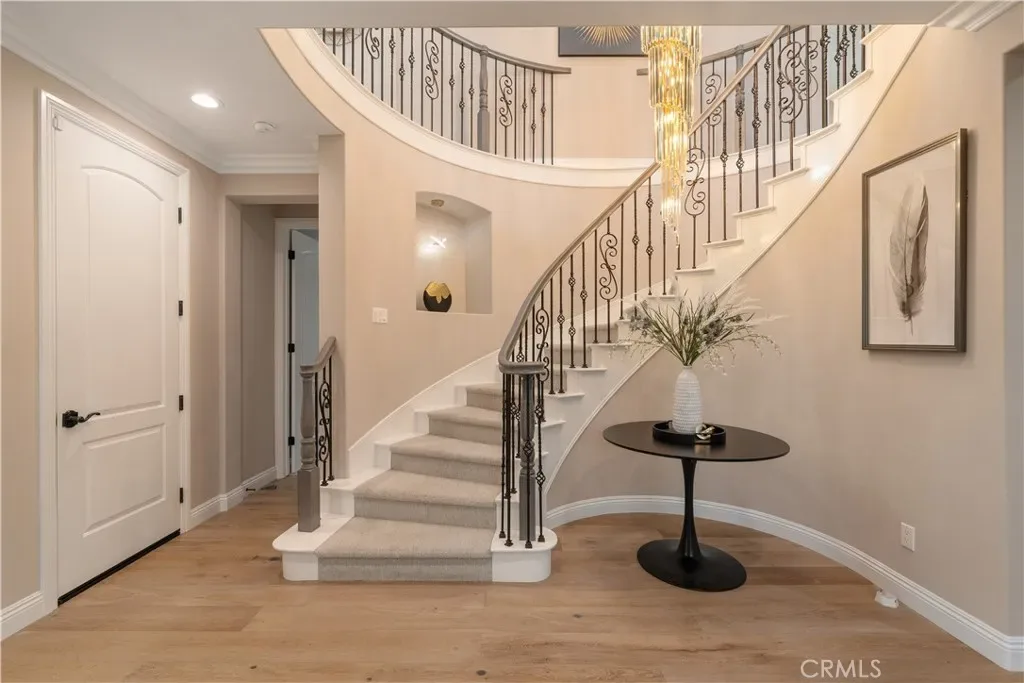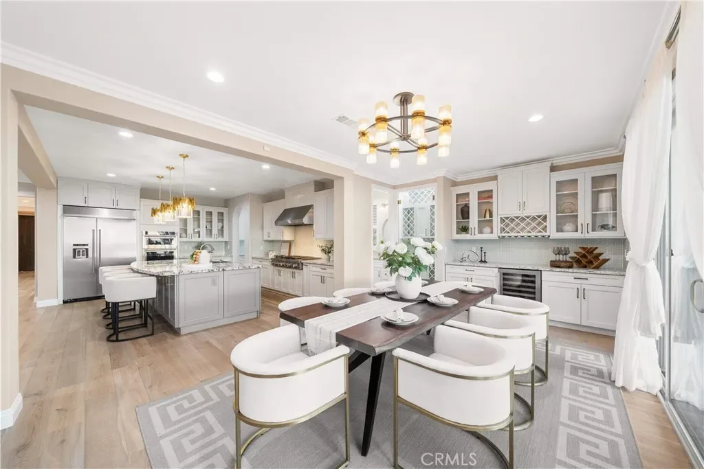 A well-designed floor plan welcomes you inside. The main level includes two en-suite bedrooms with private entrances—ideal for multi-generational living or guests—along with a dedicated office and powder room. Interior highlights include a curved wrought-iron staircase, designer chandelier, and hardwood flooring throughout the first floor. The open-concept great room features expansive sliding glass doors that seamlessly connect indoor and outdoor living. The gourmet kitchen is equipped with glass display cabinetry, KitchenAid appliances, marble countertops, and a walk-in pantry. The dining area is surrounded by sliding glass doors and complemented by a wine refrigerator and storage.