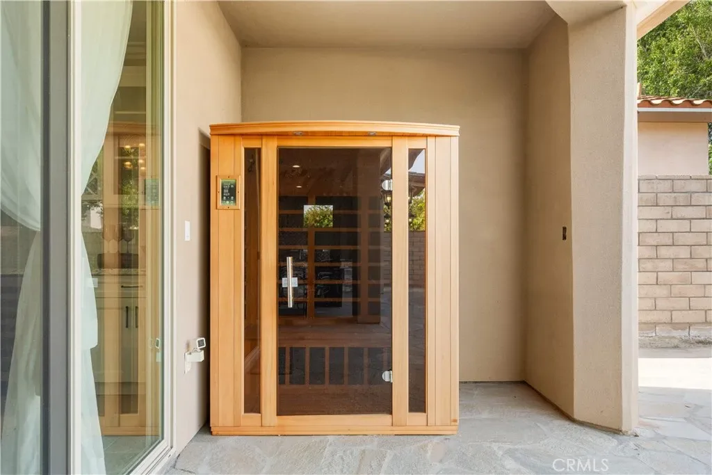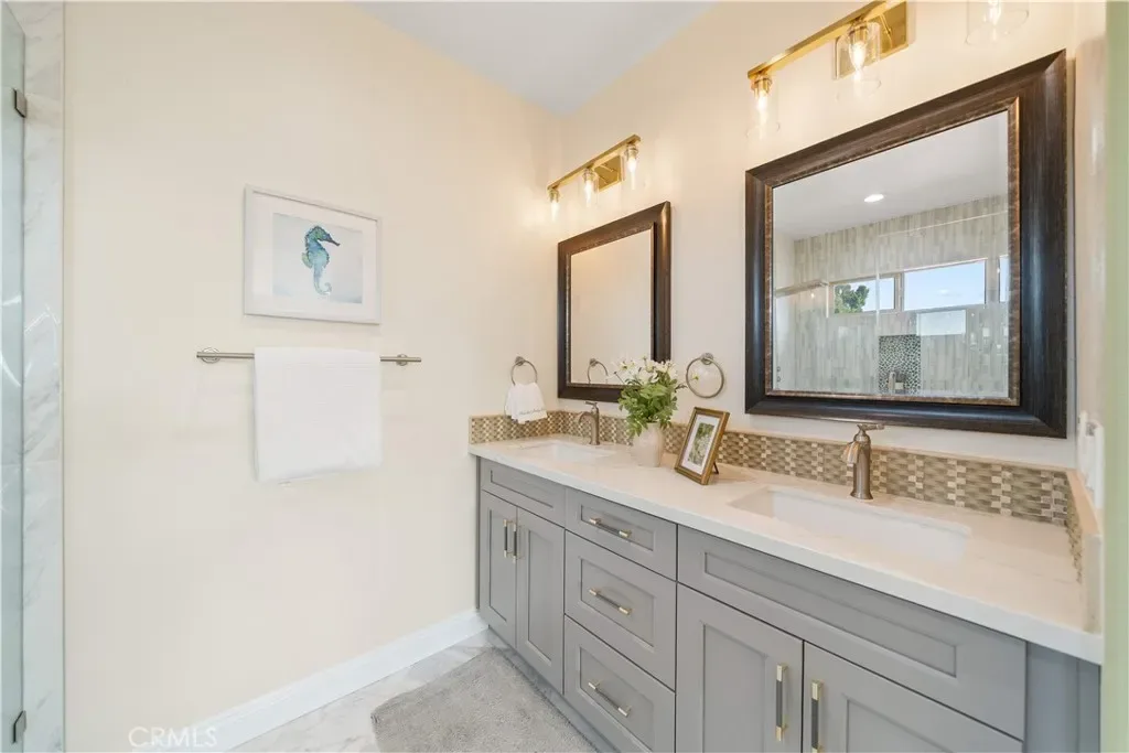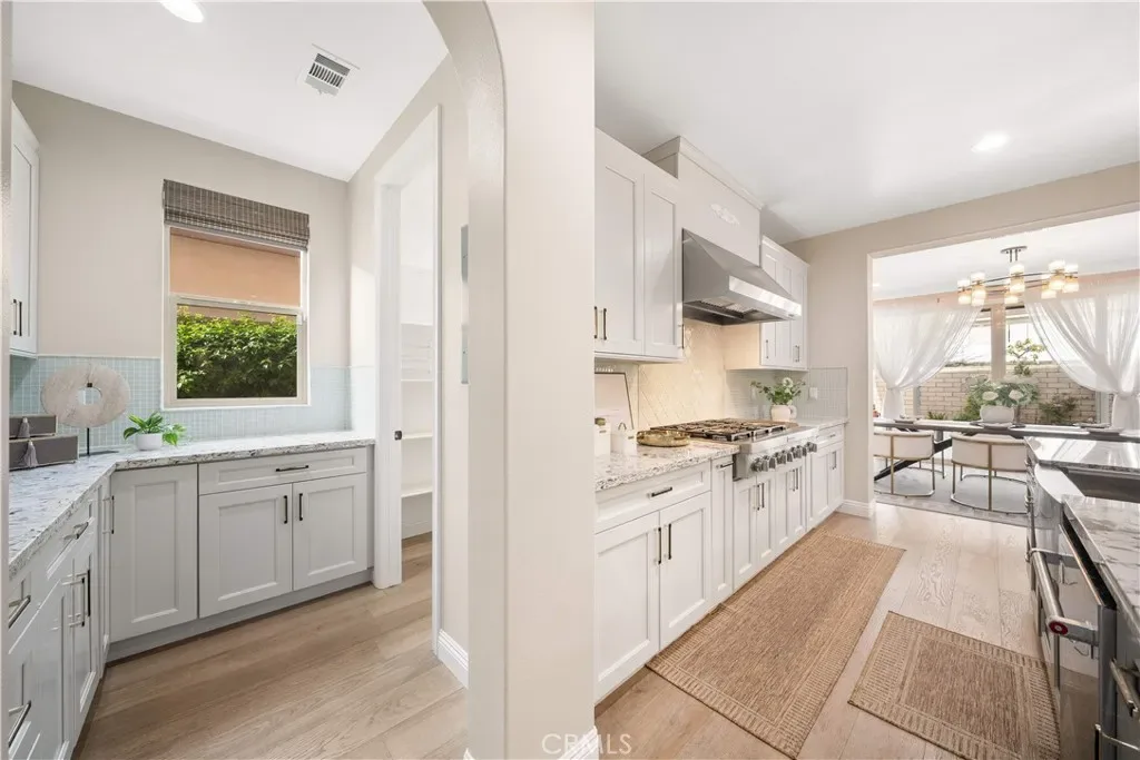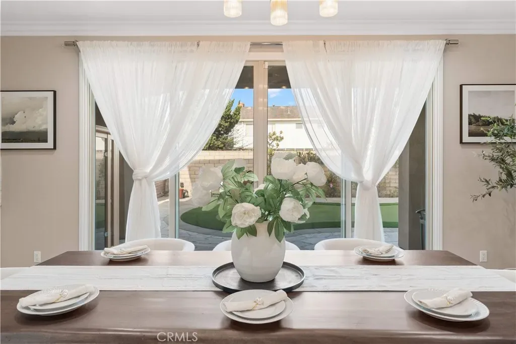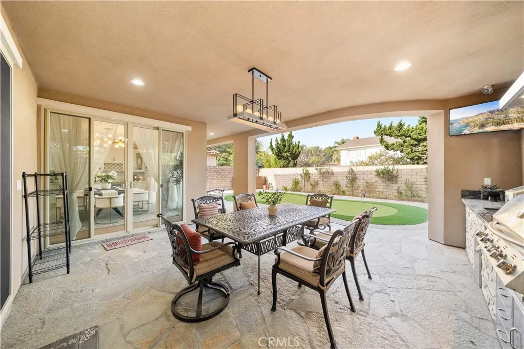 The backyard is featuring a large California Room with built-in BBQ, refrigerator, and ventilation hood, plus a putting green. The flat, generously sized yard is a rare find in South Irvine.