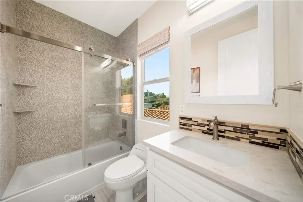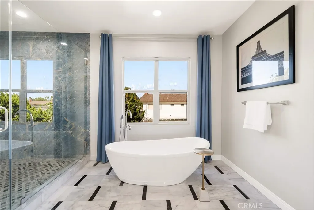 Additional features include fully paid solar, epoxy-coated garage flooring, natural stone hardscape in front and back yard, speakers