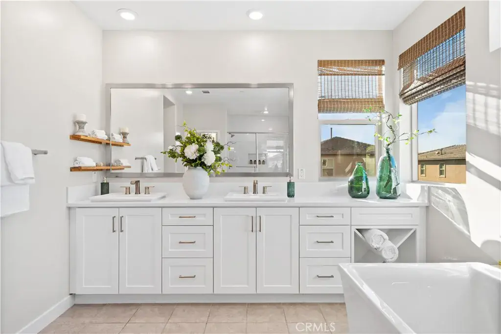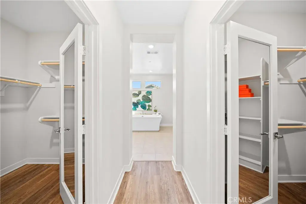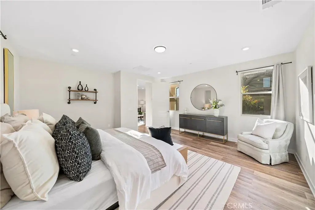 The primary suite is impressively large — offering the scale and comfort typically found in higher price points — and features dual walk-in closets and a spa-inspired bathroom with a freestanding soaking tub and walk-in shower.