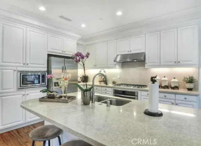 Absolutely stunning detached home in the lovely guard-gated community of Laguna Altura featuring three generous bedrooms, two and one-half baths, two-car garage with EV outlet, on a premium corner lot! Designer upgrades include elegant laminate wood floors throughout first level, custom tile floors, new plush neutral carpet in bedrooms, fresh designer paint, crown molding, and custom built-in desk area! Open and airy with popular great room, secondary bedroom features French doors opening to Juliet’s balcony, and inside laundry room. Gourmet kitchen features beautiful Corian counters, large island with sit-up bar, stainless steel appliances, built-in microwave, and under-cabinet task lighting. Spacious primary suite w/coffered ceilings, walk-in closet, and dual vanities. Enjoy award-winning Irvine schools and resort-style amenities including sparkling pool, tot-lots and close proximity to major freeways and toll roads!