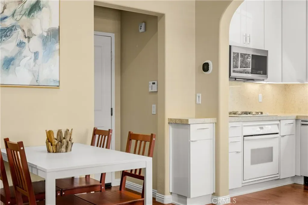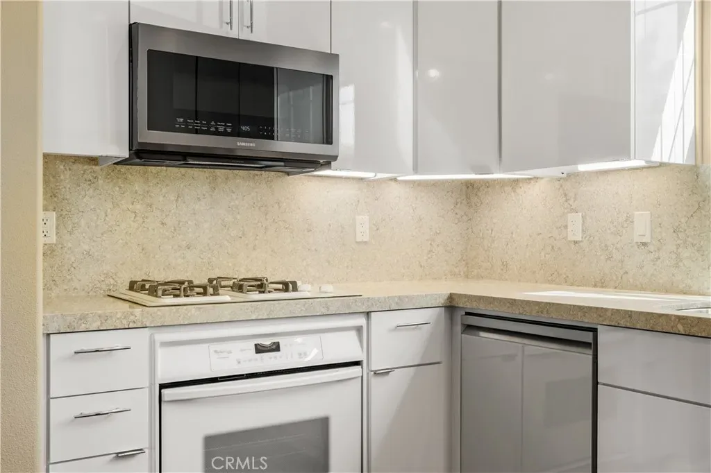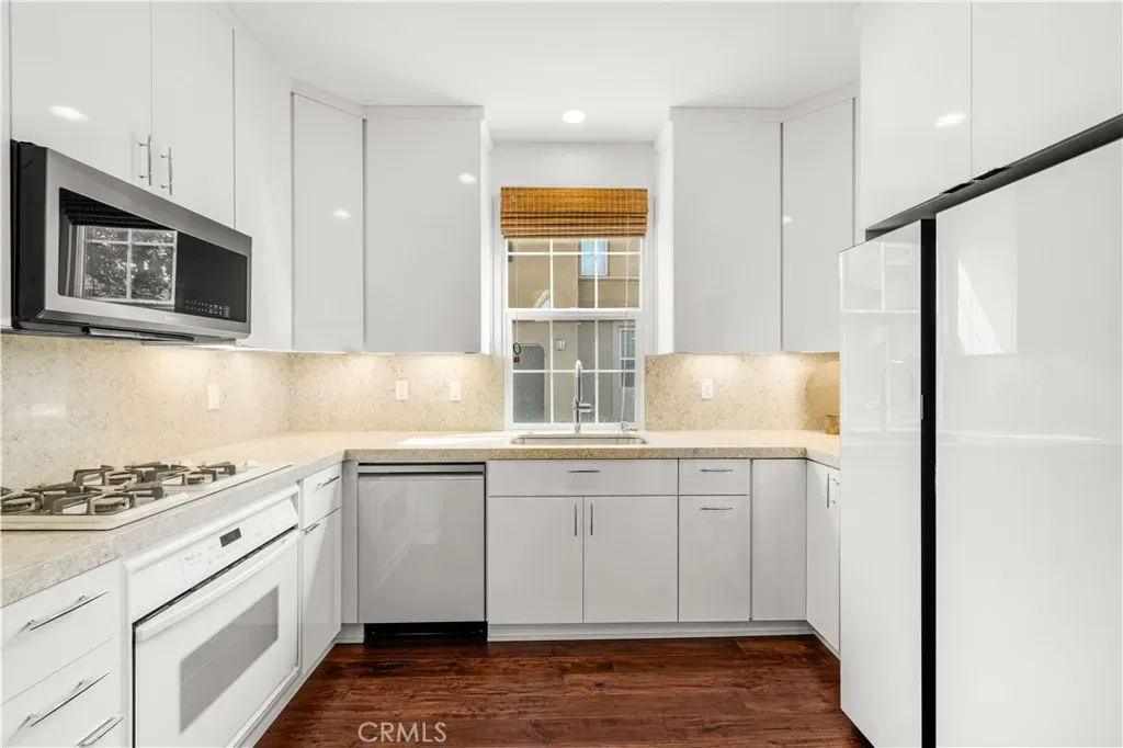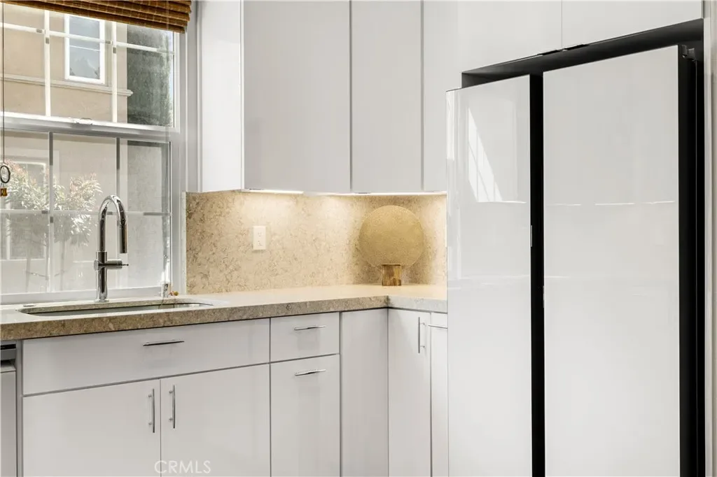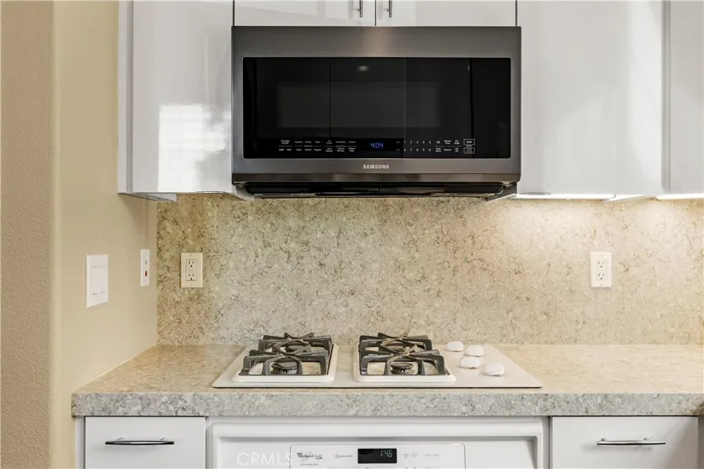 The first floor showcases beautiful Acacia hardwood flooring, while the second floor is complimented by soft Berber carpet. The remodeled kitchen is a true showpiece, featuring quartz countertops with a full-height backsplash, high-gloss white laminate cabinets with premium hardware, LED under-cabinet lighting with adjustable color settings, and modern conveniences such as a pull-out trash system, Super Susan tray storage, double knife drawer, new Kohler pull-down gooseneck faucet, Kraus stainless steel sink with rounded corners, and high end Samsung Bespoke dishwasher, refrigerator and microwave. A large walk-in pantry is located just off the kitchen, offering ample storage space.