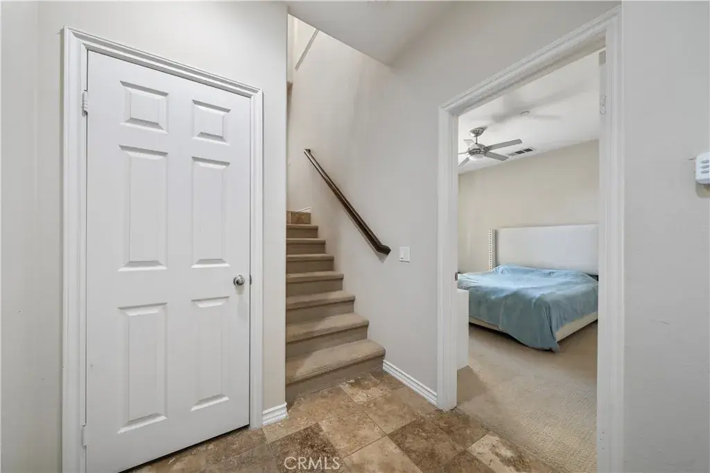 Dual Master Suites: This rare floor plan features two spacious master suites. The downstairs suite includes a walk-in closet and a large sliding door leading to a private front patio, while the upstairs suite offers privacy and comfort.