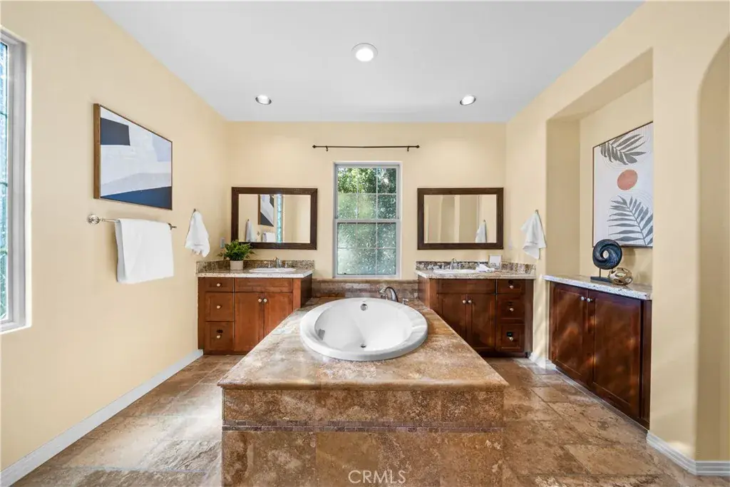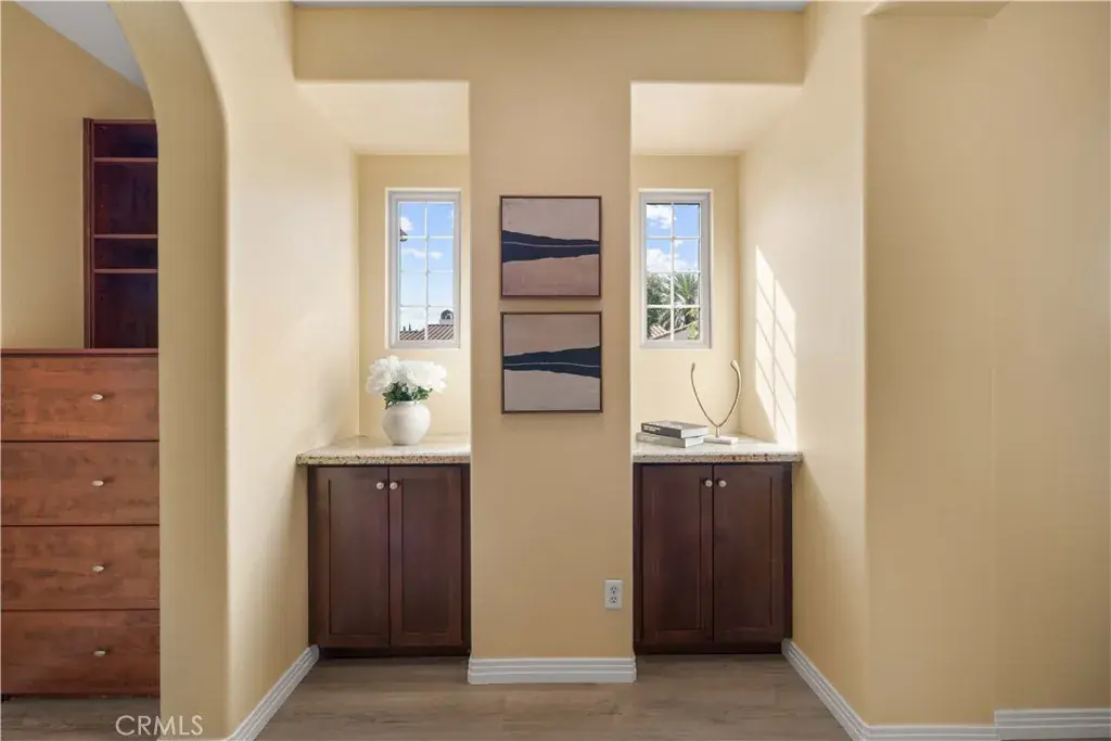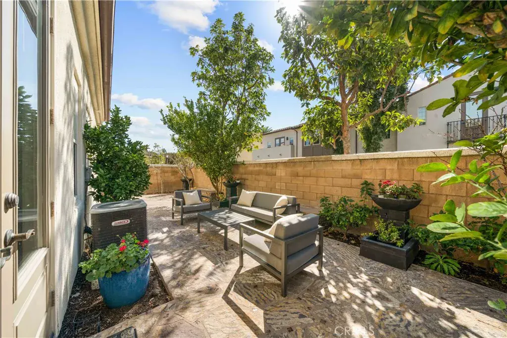 Rarely available Woodbury Treo Plan 2X featuring a master suite on each level and an exceptional 3-bedroom ensuite configuration where every room boasts its own private bathroom. This open and spacious layout feels like a single-family residence and is situated on one of the community’s largest elevated corner lots at the end of a quiet cul-de-sac. Meticulously upgraded throughout, the home showcases beautiful stone floors on the main level and high-quality wood flooring throughout the entire second level—offering a modern, carpet-free environment. The gourmet kitchen features premium stainless steel appliances and extensive stonework, overlooking a living area anchored by a grand fireplace. Custom built-ins in the closets and garage, luxurious multi-layered crown molding, designer paint, and upgraded chandeliers highlight the interior’s sophistication. The oversized, professionally landscaped yard is a true sanctuary with flagstone flooring, water features, seat walls, and a wide variety of established fruit trees. Enjoy resort-style living with walking access to 14 parks, 7 pools, tennis courts, and the Jeffrey Open Space Trails, while being minutes from world-class shopping and top-rated Woodbury Elementary and Jeffrey Trail Middle School.