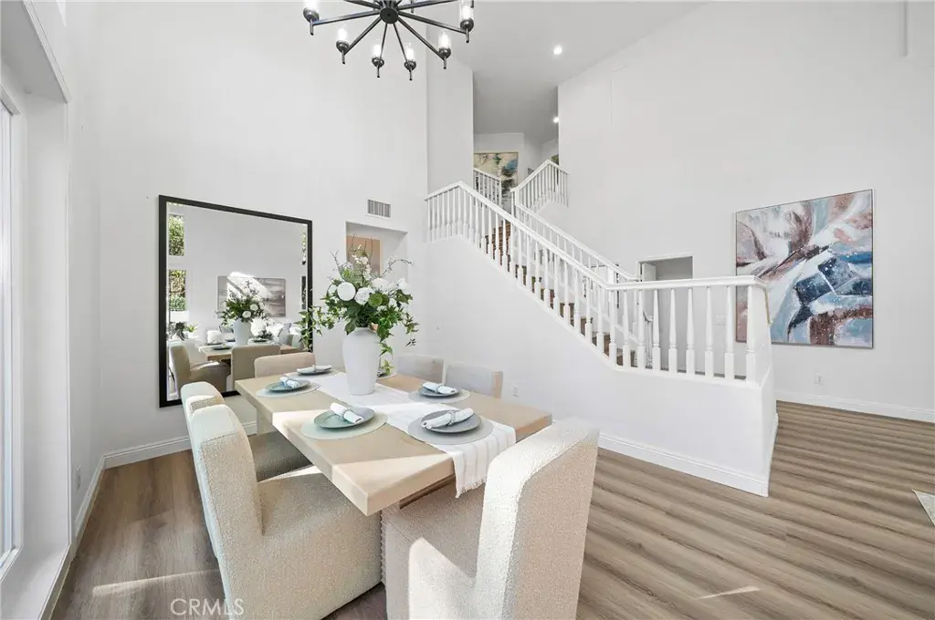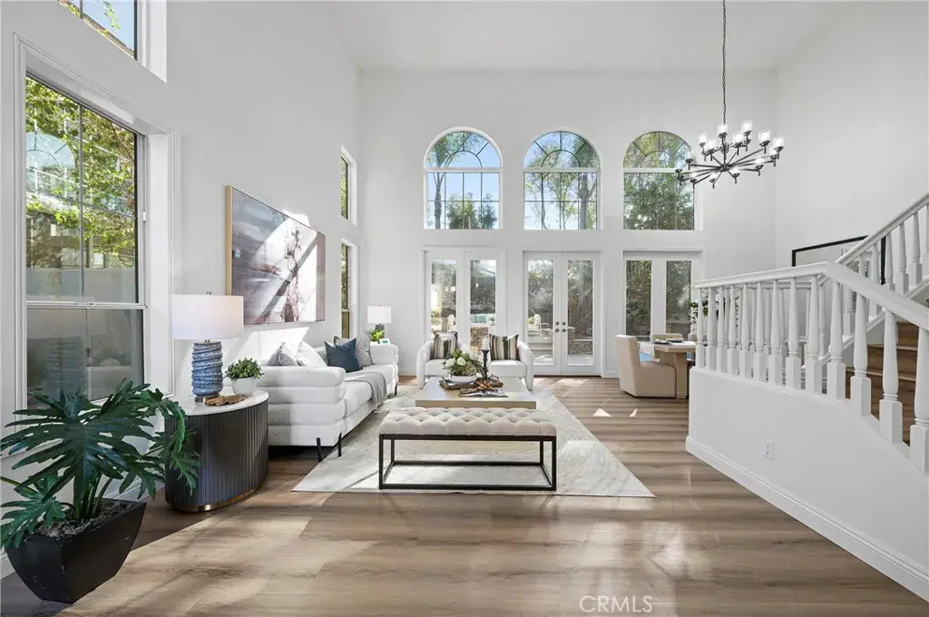 This spectacular residence offers a bright and open floor plan highlighted by soaring two-story ceilings in the living and dining rooms. Dramatic floor-to-ceiling windows and French doors fill the home with natural light and create an elegant sense of scale.