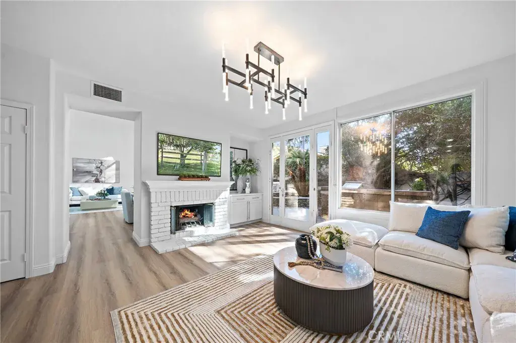 The upgraded modern kitchen is designed for both functionality and style, opening seamlessly to the family room with a warm fireplace—perfect for everyday living and family gatherings.
