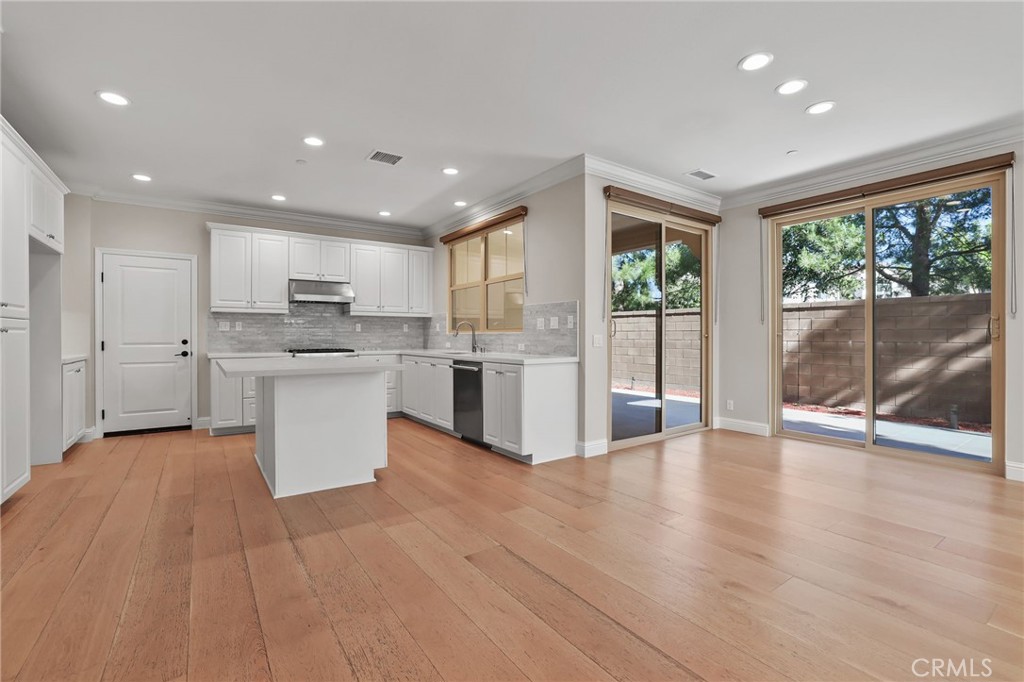 The open-concept floor plan offers a bright living space that flows seamlessly into the dining area and modern kitchen, complete with stainless steel appliances, sleek countertops, and a large center island perfect for everyday living and entertaining.
