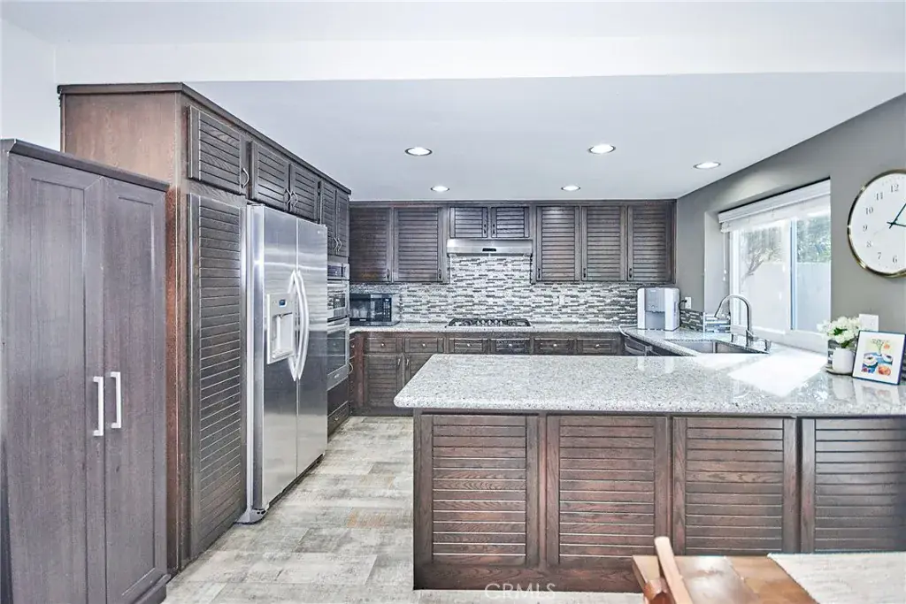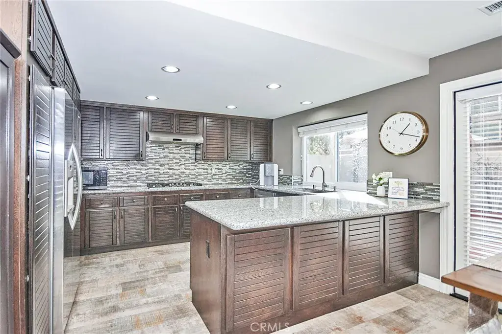 • Well remodeled with granite countertops, new dishwasher, new faucets, custom tile backsplash, stainless steel appliances, wall oven, microwave, stove, and breakfast bar.