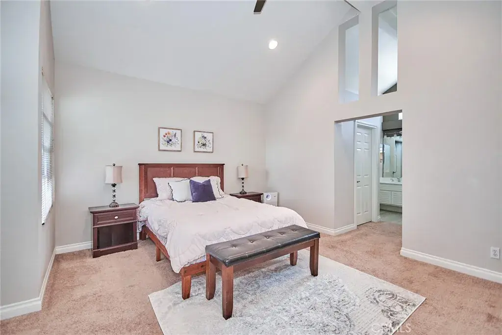 • Upstairs offers generously sized two bedrooms and remodeled bathroom, Primary Suite with vaulted ceiling, new flooring at bathroom, large walk-in closets, and a ceiling fan. Luxury En-Suite Bath with dual vanities, oversized walk-in tile shower, and tile flooring.