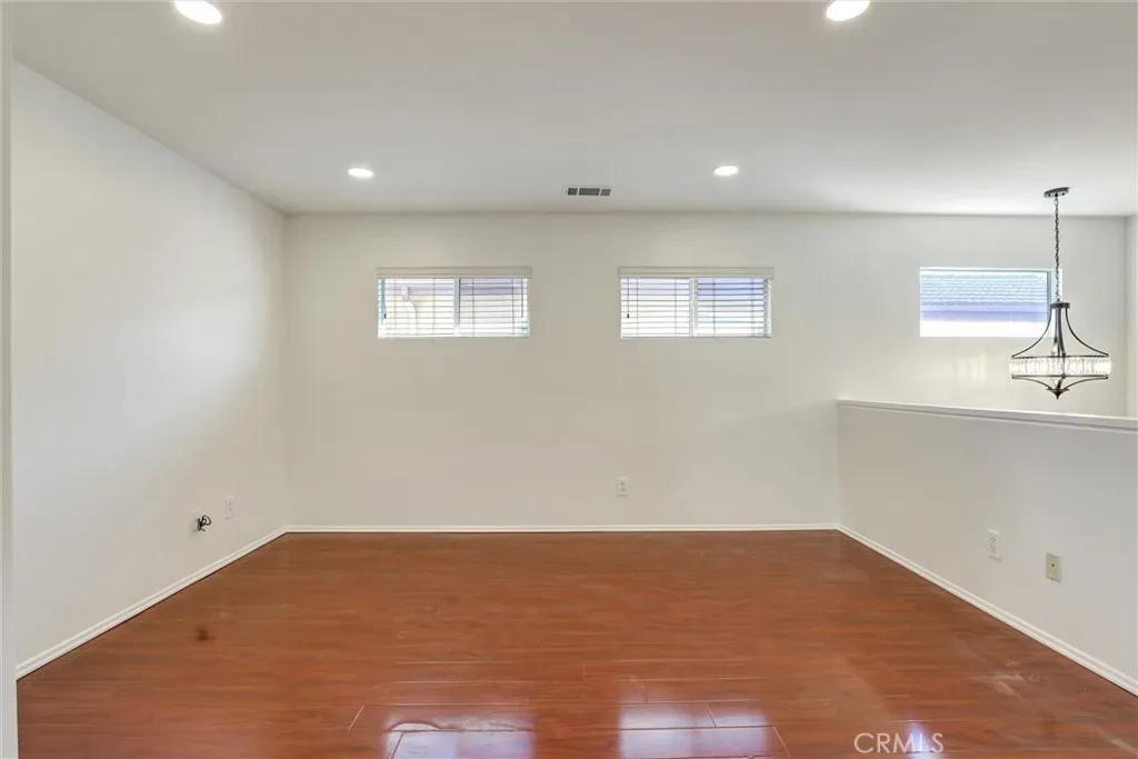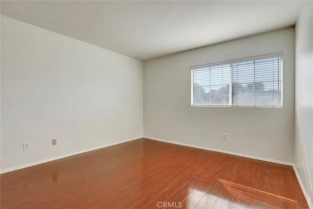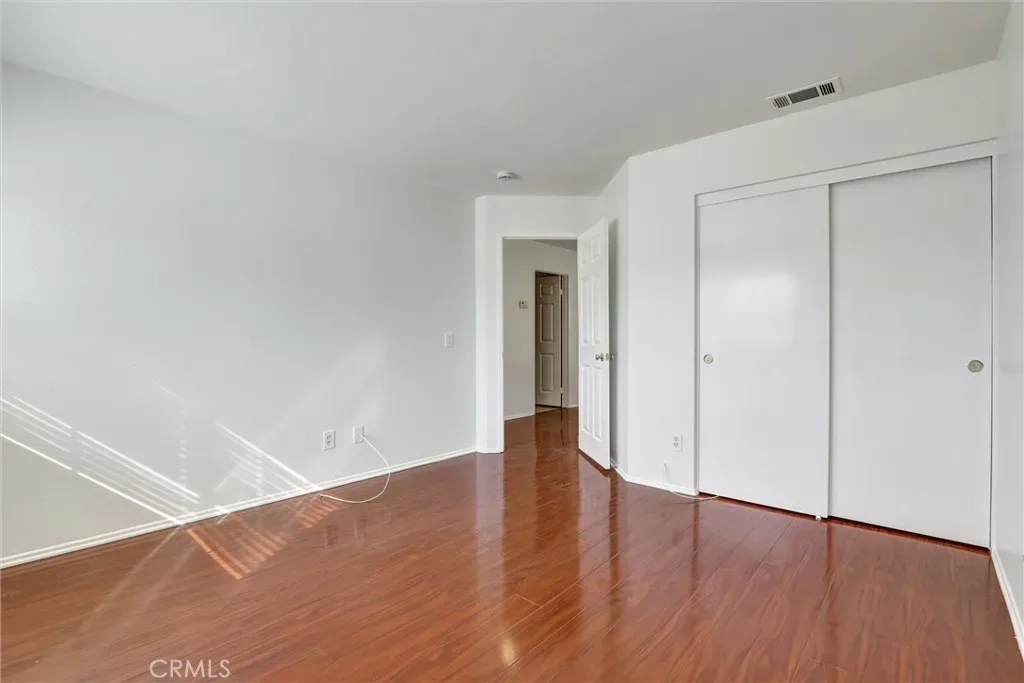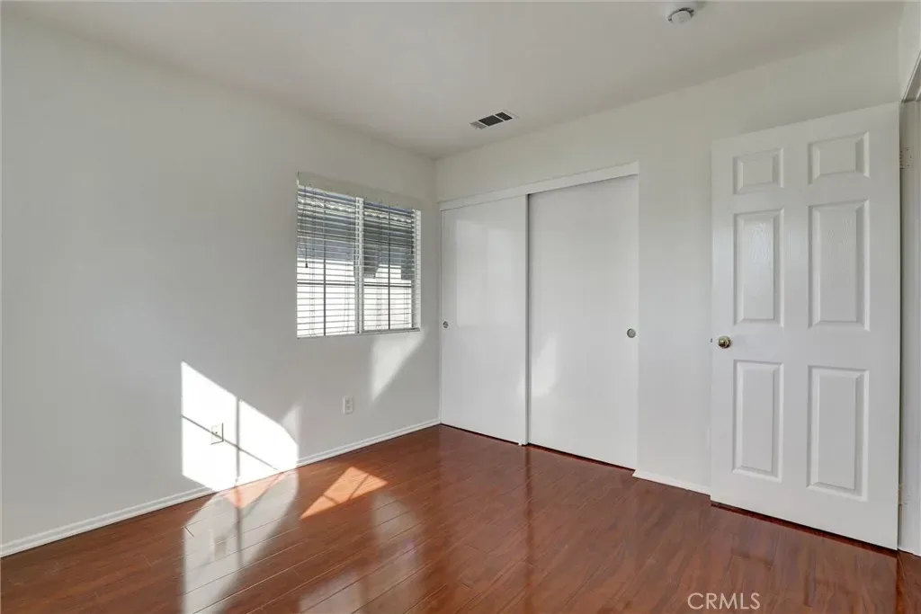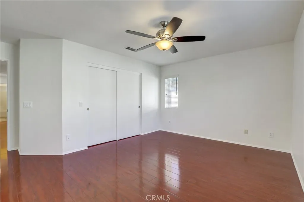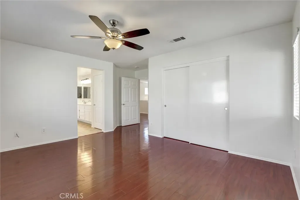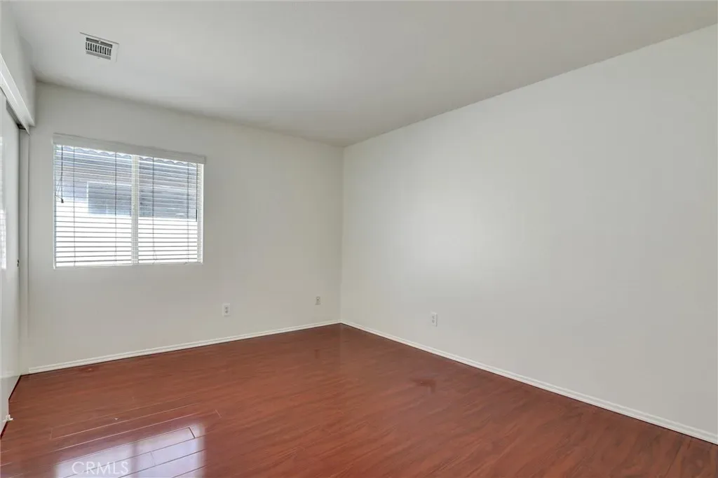 Retreat to the spacious master bedroom, designed with comfort and versatility in mind. Featuring rich polished wood flooring and crisp white walls, the room exudes a clean and modern aesthetic. Dual windows with blinds invite natural light while offering privacy. A ceiling fan with integrated lighting ensures year-round comfort, while the ceiling vent enhances airflow. This master bedroom offers the perfect canvas for your personal style.