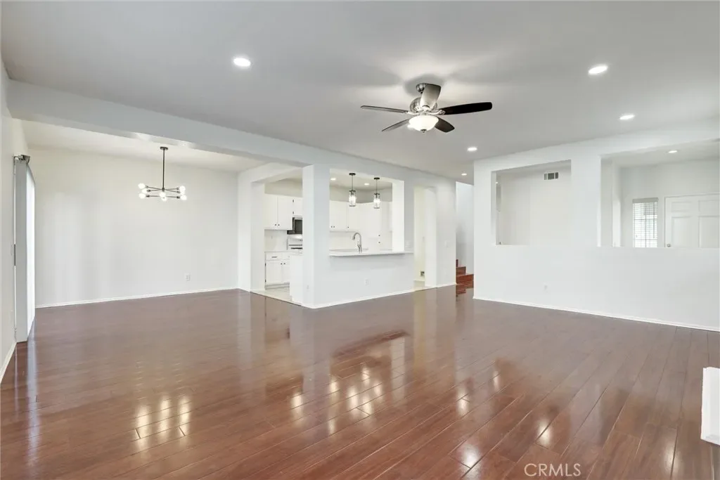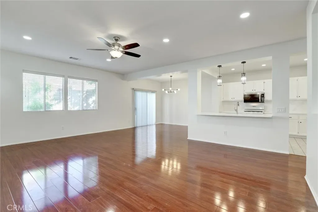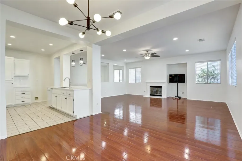Step into this stunning open-concept living space that seamlessly blends modern elegance with everyday comfort. The kitchen showcases crisp white cabinetry, a spacious island with bar seating, built-in sink, and stylish pendant lighting—perfect for entertaining or casual meals. Flowing effortlessly into the living room, you’ll find rich wood floors, recessed lighting, a cozy fireplace with a classic white mantel, and it could be accented by built-in shelving or mount flat-screen TV for relaxed evenings at home. This bright and inviting layout highlighting the clean lines and contemporary finishes throughout is ideal for both quiet moments and lively gatherings.