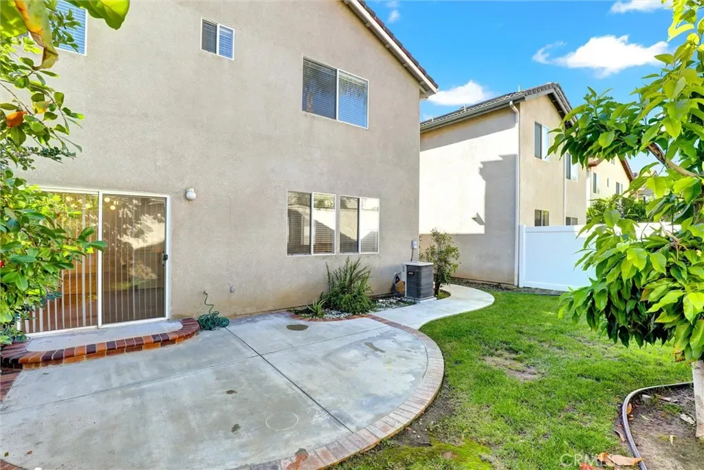The backyard features a curved concrete patio bordered with brick accents, ideal lounging. The lawn, including trees and shrubs along the perimeter create private atmosphere, all enclosed by a brick-base fencing. A sliding glass door offers seamless indoor-outdoor flow, while the air conditioning unit is discreetly positioned. This backyard is perfect for entertaining and relaxing.