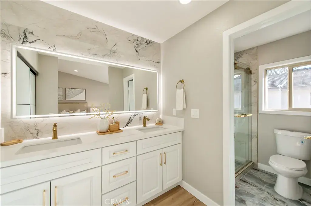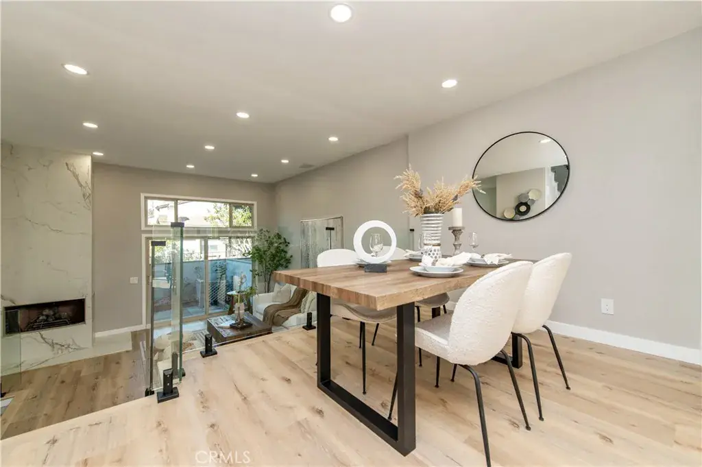 The open-concept floor plan features 3 bedrooms and 2.5 bathrooms, soaring high ceilings, and abundant natural light. The spacious primary suite is a true retreat, highlighted by a luxurious spa-style bathroom with stunning designer showers and modern LED mirrors. The home showcases high-end finishes throughout, including a designer open kitchen equipped with a gas stove, a striking modern fireplace, and sleek glass stair railings. Additional upgrades include new recessed LED lighting, brand-new luxury vinyl hardwood flooring, and brand-new dual-panel windows and sliding doors.