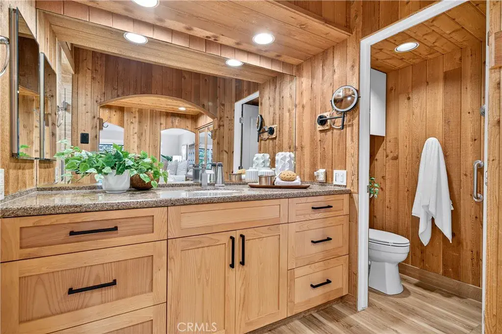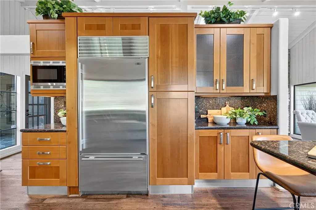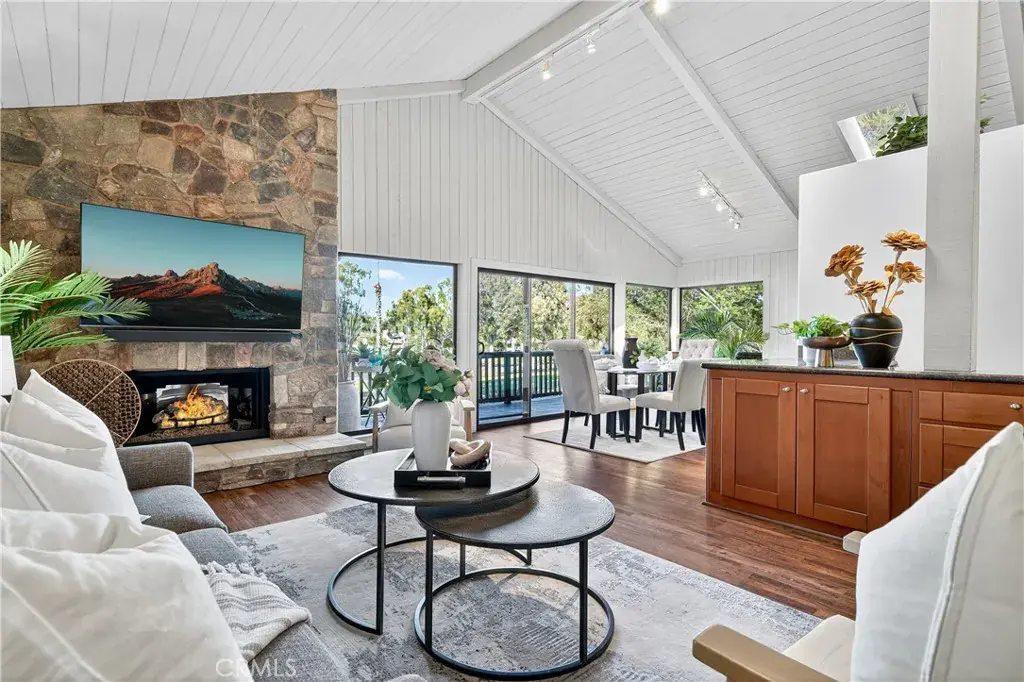 Inside, the open floor plan boasts cathedral ceilings, dual-pane windows, and abundant natural light. The living room opens to the dining area, while the remodeled gourmet kitchen—with top-of-the-line stainless steel appliances, granite counters, custom cabinetry and recessed lighting—flows seamlessly into the dining area. Sliding glass doors in both the dining room and kitchen lead to a wrap-around deck extending around the back and side of the home, perfect for indoor-outdoor living.