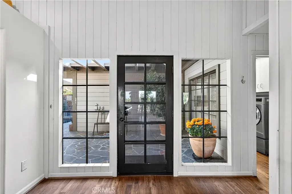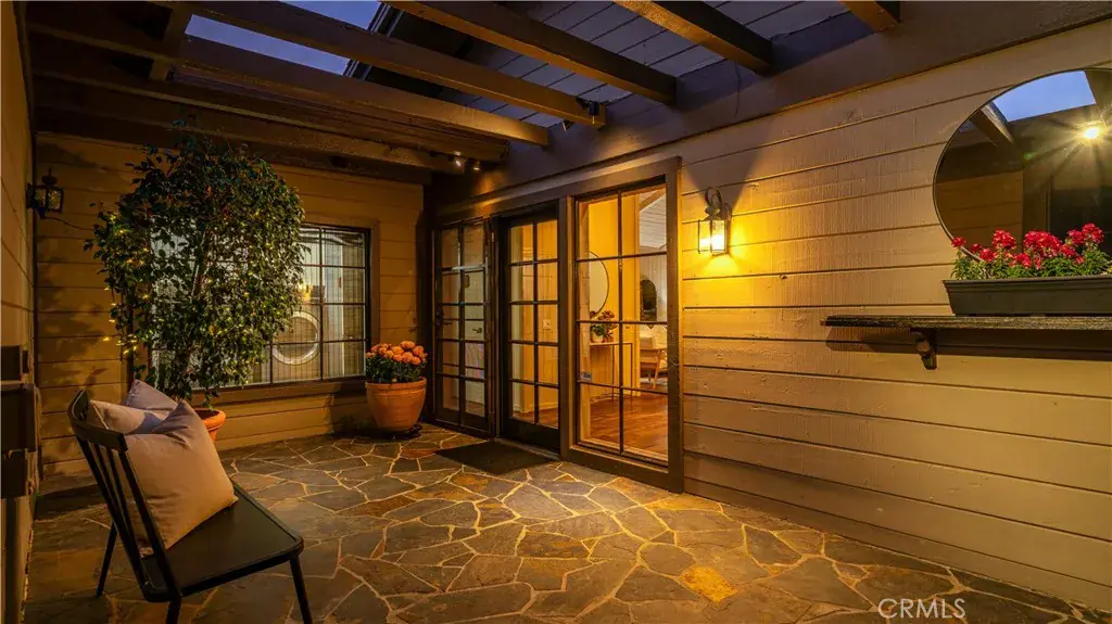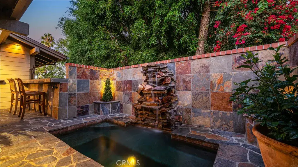 Step through the front gate into a tranquil, private courtyard with warm lighting, featuring a custom heated spa, a rock waterfall, and a bar-height counter overlooking lush greenery—ideal for entertaining or unwinding.