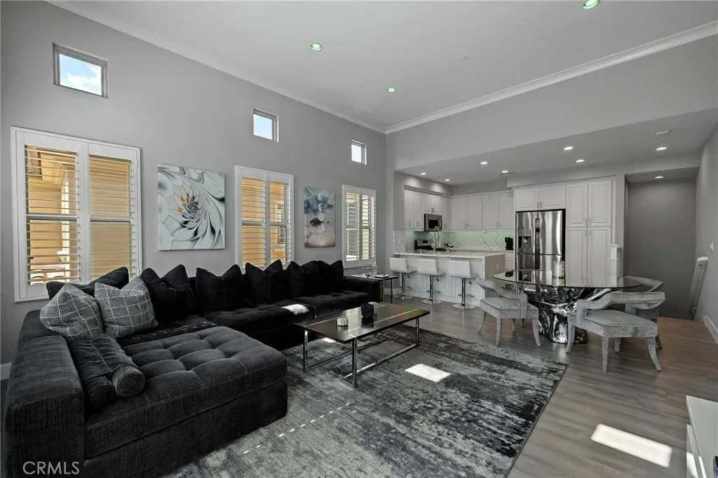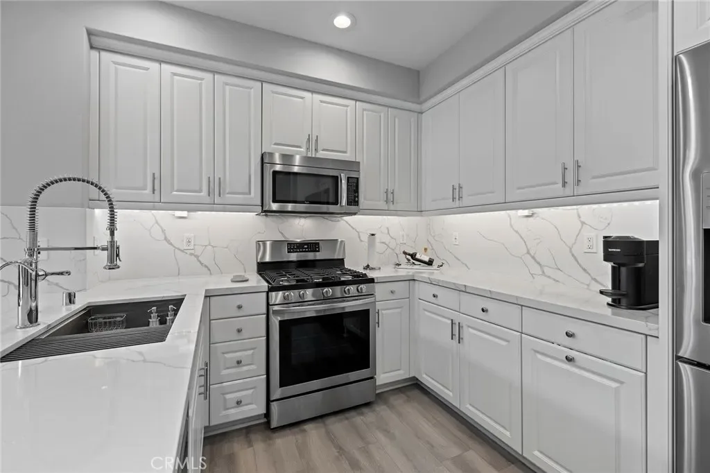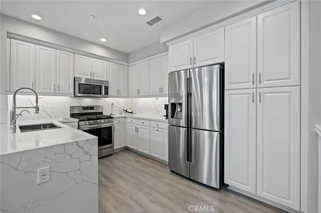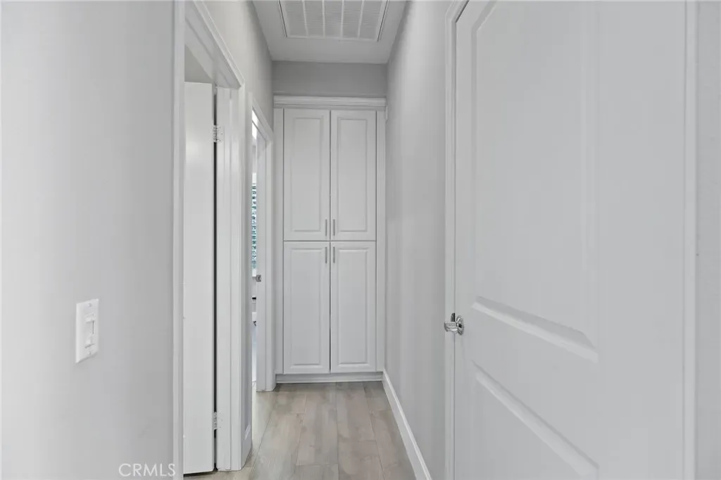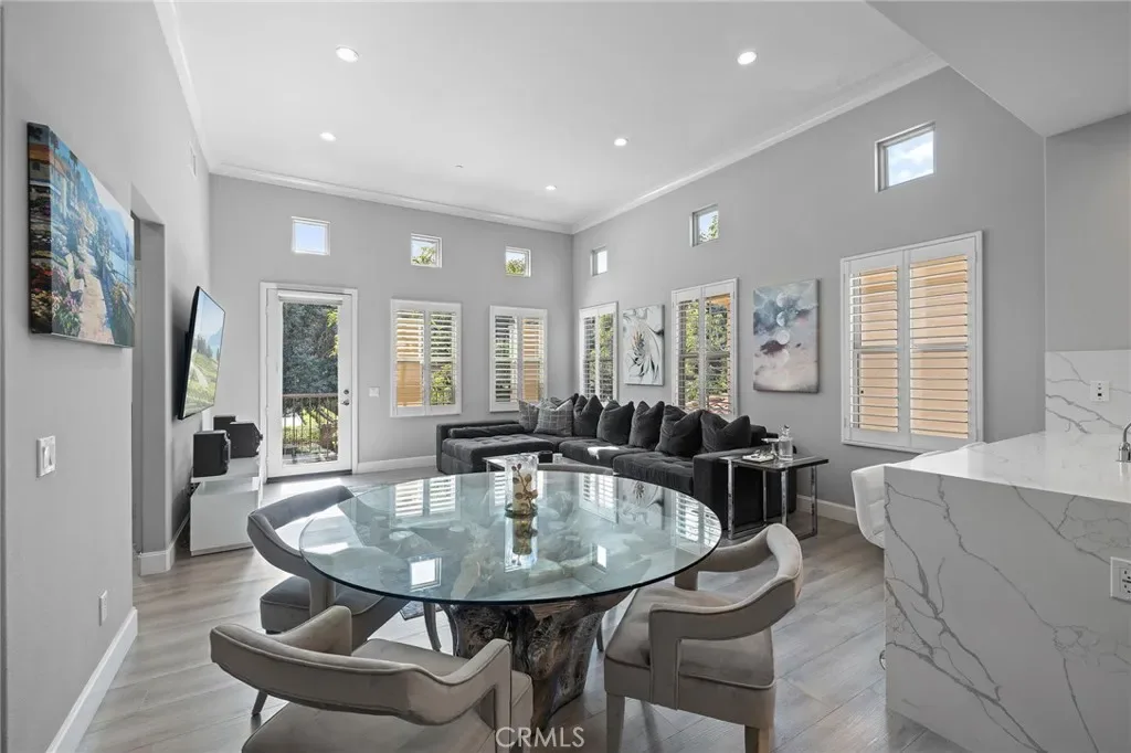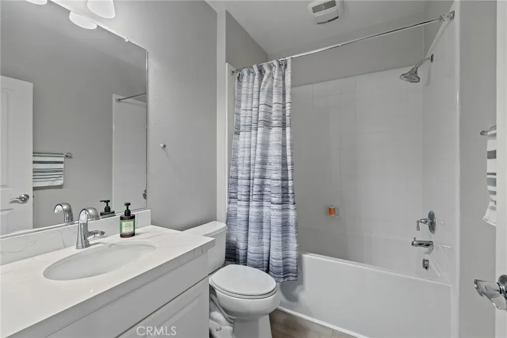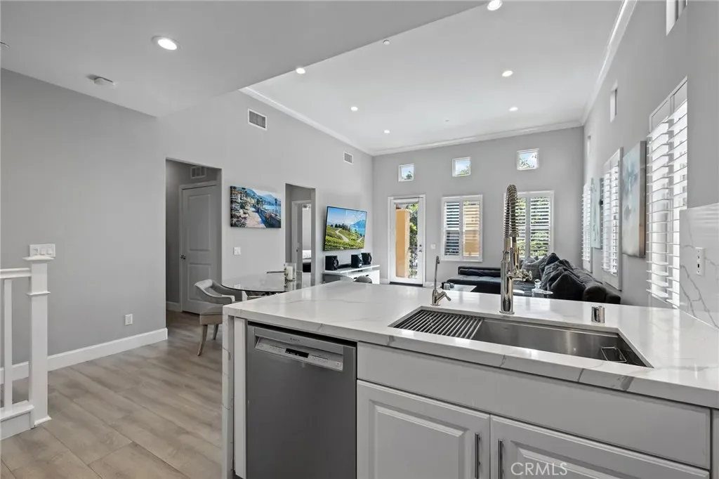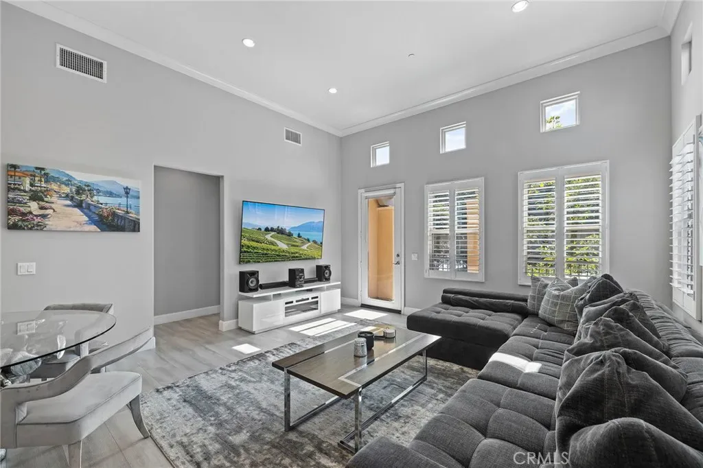 Welcome to 16 Serenity, a stunningly remodeled 2 bedroom, 2 bathroom Santa Rosa Plan 3 condominium in the prestigious Woodbury East Community of Irvine. This rare corner upper unit offers the ultimate convenience of all living spaces on one floor, featuring an open floor plan with soaring cathedral ceilings and an abundance of natural light through large windows with plantation shutters. The interior has been beautifully transformed with elegant Calacatta quartz countertops in both the kitchen and bathrooms, complemented by modern LED recessed lighting that is fully integrated and controlled by a smart home ecosystem. The gourmet kitchen is fully equipped with all stainless steel appliances in like-new condition. Durable and stylish laminated wood floors run throughout the entire home, which also boasts an abundance of storage options and a convenient in-unit laundry closet. The primary suite offers a private retreat with double sinks, a walk-in shower, and a spacious walk-in closet. Additional upgrades include crown molding and a private living room balcony.This rare end unit ensures maximum privacy with only one shared wall and no neighbors living above. The attached side by side 2-car garage is finished with epoxy flooring and extra storage space. Residents enjoy resort-style amenities at the Woodbury East clubhouse, including a pool, spa, fitness center, and sports courts. Perfectly located, this home is walkable to Woodbury Town Center and top-tier Irvine Unified schools, including Woodbury Elementary, Jeffrey Trail Middle, and Portola High School. This turnkey gem won’t last, waste no time to view this incredible property and make it your dream home today!
