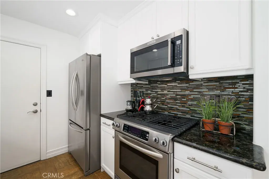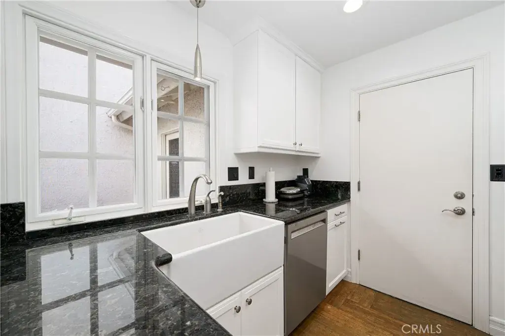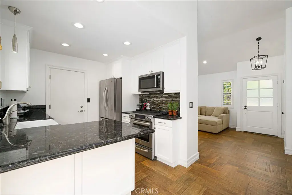 This stunning Updated Kitchen combines style and function with granite countertops, a designer glass tile backsplash, and a spacious ceramic farmhouse sink and breakfast bar. Soft-closing cupboards provide a quiet touch of luxury, while sleek stainless-steel appliances offer both elegance and performance.