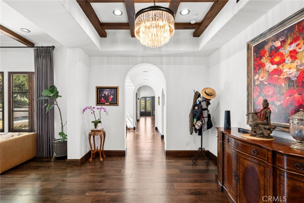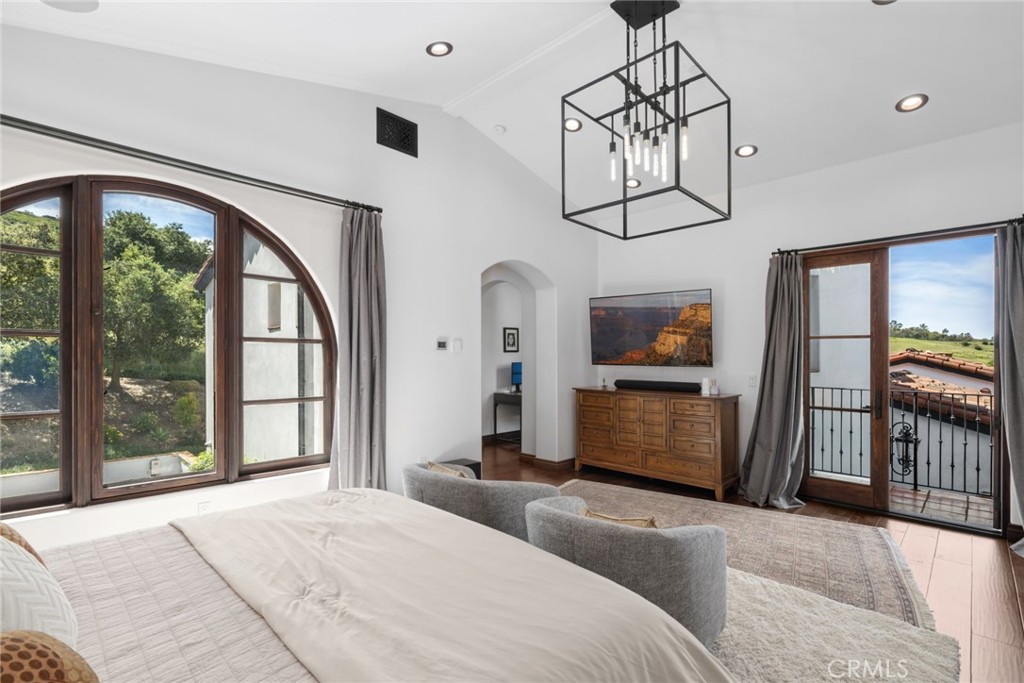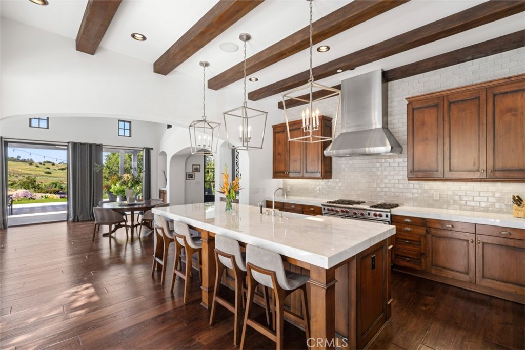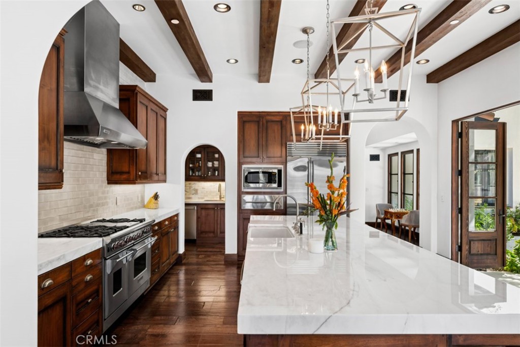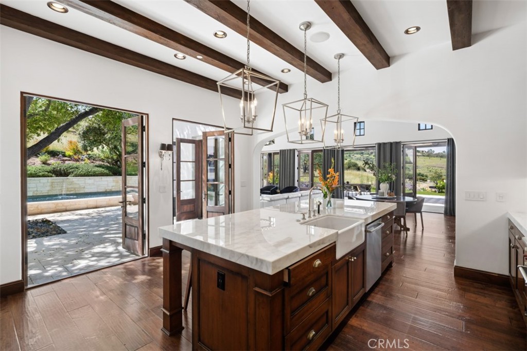 Reimagined with a second level addition adding a new suite of bedrooms including a luxurious primary suite, this classical Santa Barbara style home is both warm and deliberate in its simplicity. White stucco walls, exposed wood beams, and beautiful finishes establish a quiet palette, while a series of openings via French doors dissolve the line between indoors and out. The kitchen and family room unfold as one continuous space, oriented entirely toward the rear terrace and views beyond, and the modern pool and spa, allowing daily life to move fluidly between interiors and the outdoors.