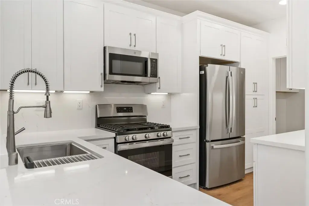 Welcome to your dream home in the heart of Irvine! This stunning three-bedroom, three-bathroom end unit townhome has been meticulously remodeled to perfection, offering a harmonious blend of modern elegance and comfortable living. Upon entering, you’re greeted by the airy ambiance and sleek design, with wood laminate flooring seamlessly guiding you through the open-concept living space. The focal point of the home is the newly renovated kitchen, boasting crisp white cabinets, luxurious quartz countertops, and stainless steel appliances, including a stainless steel refrigerator, creating an inviting atmosphere for culinary adventures and entertaining guests. The cozy gas fireplace in the living area adds warmth and charm, making it the perfect spot to relax. With one bedroom conveniently located downstairs next to full bath, this home offers flexibility and convenience for guests or multigenerational living. The spacious laundry room provides ample storage and functionality, making household chores a breeze. The master bedroom features dual closets, ensuring plenty of storage space. Step outside to the expansive patio yard, perfect for al fresco dining, gardening, or simply unwinding in the California sunshine. As an end unit, you’ll enjoy added privacy and tranquility in your outdoor oasis. New built in BBQ. This residence also features an attached two-car garage, providing secure parking and additional storage options. Situated in a gated community, you’ll experience peace of mind and security, allowing you to fully enjoy the amenities and vibrant lifestyle of Irvine. Conveniently located near top-rated schools, parks, restaurants, and shopping destinations, this home offers the epitome of suburban living with urban conveniences at your fingertips. Don’t miss your opportunity to experience the luxury and comfort of this remodeled townhome in one of Irvine’s most coveted neighborhoods. Schedule your showing today and make this your new address!