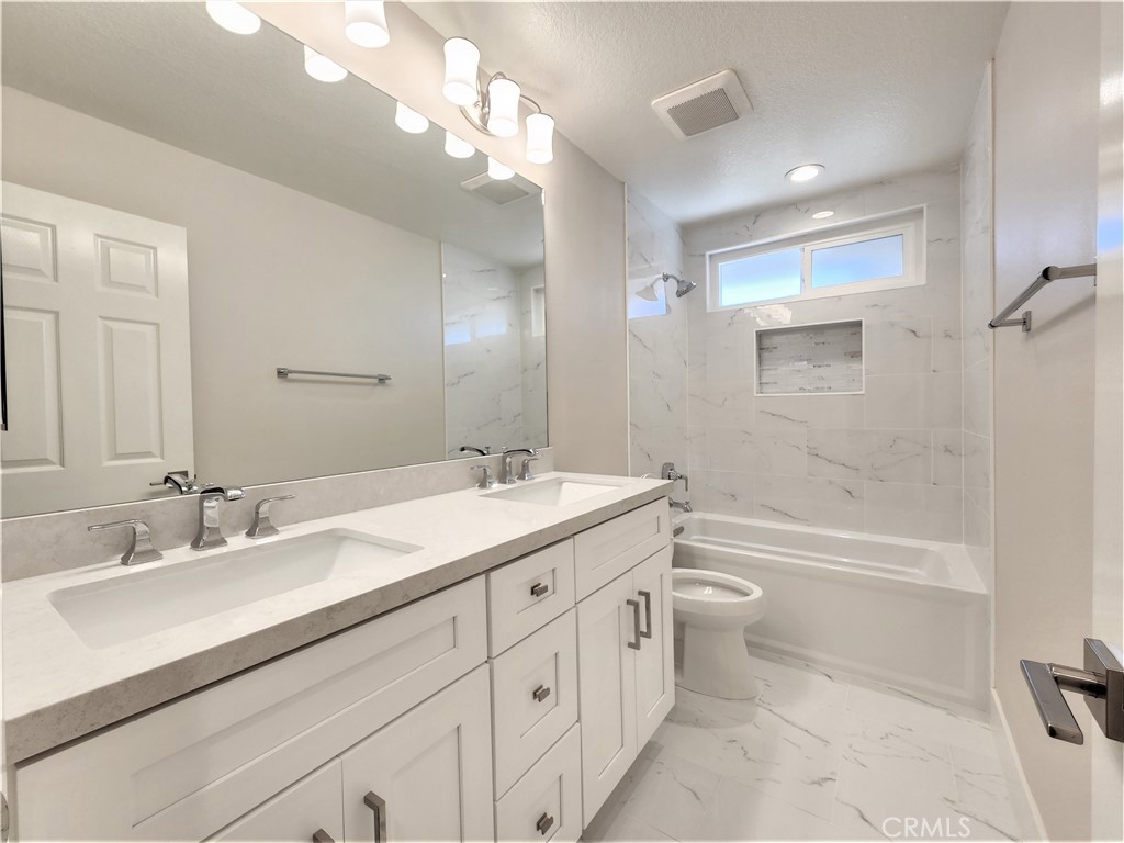 Welcome home to this just fully remodeled 5 bedrooms 3 full baths single-family home in the highly desirable Westpark neighborhood! This home welcomes you to an open and spacious floor plan with soaring high ceilings, grand staircase, large open living room with dedicated dining room. Entertain in the family room with a cozy Italian white marble tile fireplace and large all brand-new chef’s dream kitchen with designer finishes and appliances. Plenty of cabinet storage space along with a breakfast nook area overseeing the beautiful backyard landscape. Separate large sliding glass doors invites you to your private oversized yard with well-manicured landscape, large grass area with plenty of room to play and entertain. First floor features a bedroom and a full bath. Walk up the grand staircase to the second floor with two secondary bedrooms, bonus room, and additional cabinet / closet storage space in the walkway area. The grand Master bedroom with high vaulted ceilings connects to a spa like bathroom with long dual sink vanity, large soaking tub, walk-in shower, and his-and-her closet space. This home features luxury-vinyl designer flooring first floor, LED recessed lights throughout, all energy efficient dual-pane windows. Additional convenience like laundry room with cabinets and sink, attached 3 car garage with full driveway. Excellent location near award winning schools, parks, HOA pools and easy access to the 405 freeway, shops, restaurants and entertainment.