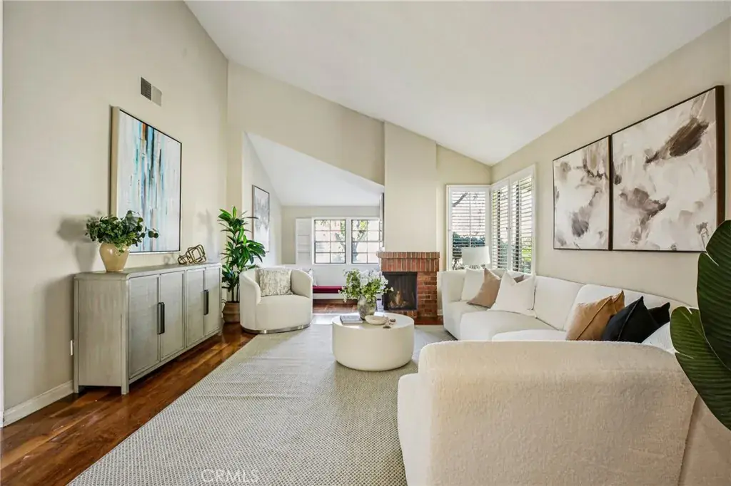 Upon entry, you are welcomed by a beautiful atrium that fills the home with light and creates an inviting sense of openness. The spacious living room and separate dining area showcase high ceilings and benefit from abundant sunlight throughout the day. A classic red brick fireplace anchors the sitting area, providing warmth, character, and a perfect place to relax.