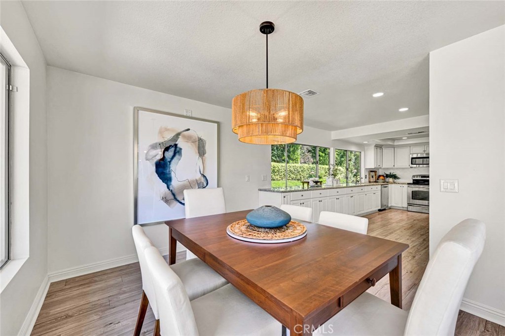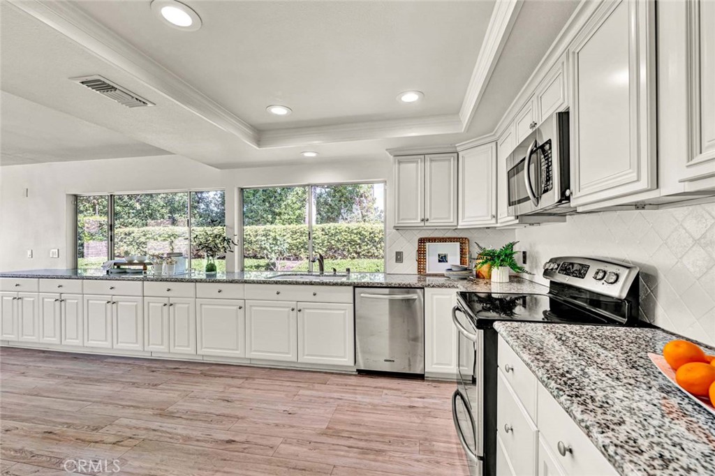 Inside, the updated kitchen features newer cabinetry, countertops, and appliances, with large windows framing serene landscaping views. The kitchen opens to a bright dining area, while the spacious living room offers a cozy fireplace, a wet bar, and direct access to the expansive patio—ideal for relaxing or entertaining.