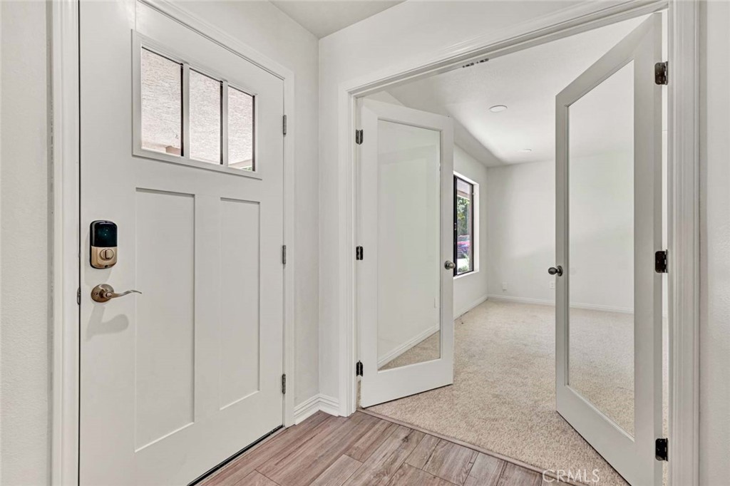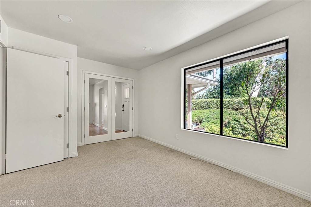 The primary suite features dual closets and a beautifully remodeled bathroom with a custom walk-in shower and a solar tube for natural light. Secondary bedrooms include new designer carpet, with one offering double French doors—perfect for a home office or flexible living space.