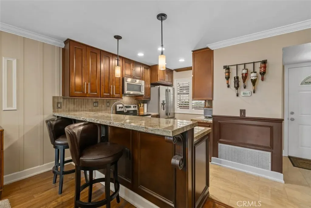 The remodeled kitchen features granite countertops, stainless steel appliances, newer wood cabinetry with cabinetry that extends above and around the refrigerator, a breakfast bar with overhang, pendant lighting, and a full porcelain tile backsplash. The entry, kitchen, and powder room are finished with rich tile flooring, while the living and dining areas offer recessed lighting, smooth ceilings, hardwood floors, and plantation shutters. The downstairs powder bath includes designer finishes and full-height tile surround.
