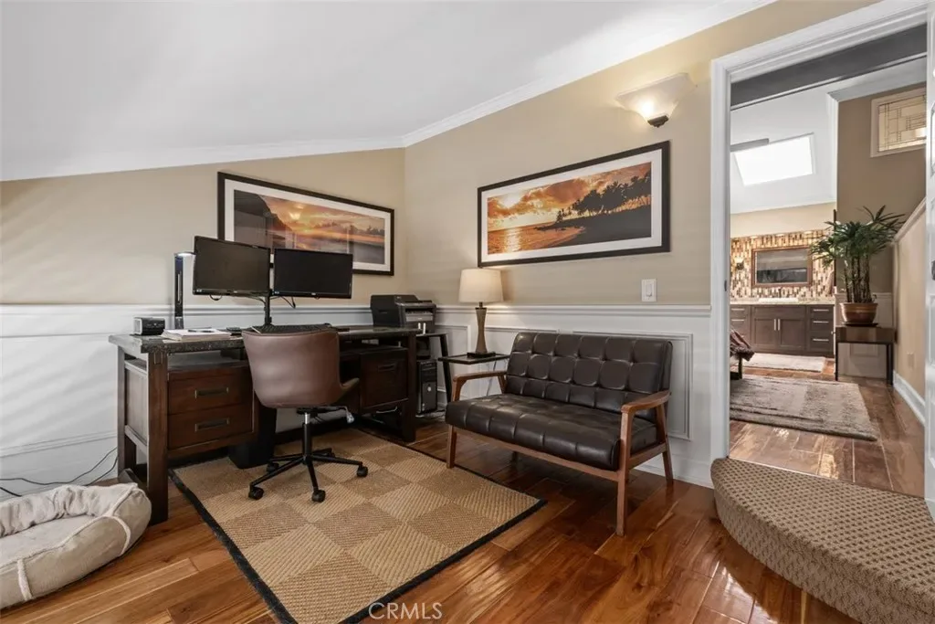 Upstairs, the vaulted primary suite offers a skylight, ceiling fan, walk-in closet with organizer, and a fully renovated bathroom with granite counters, a raised vanity with vessel sink, stacked-stone backsplash, framed mirror, and a custom walk-in shower. A dedicated upstairs bonus room or office provides valuable additional living space, complete with hardwood flooring, a storage closet, wainscoting, and shutters for privacy and light control.