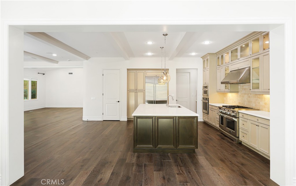 The open-concept floor plan showcases soaring ceilings, hardwood flooring, and expansive accordion doors that seamlessly connect the indoor living space to the outdoor California Room. The chef’s kitchen features full-height European-style cabinetry, quartz countertops, a stone backsplash, professional-grade stainless steel appliances including a built-in Sub-Zero refrigerator, three ovens, and a large center island overlooking the dining and living areas. A separate prep kitchen with an additional range, refrigerator, and dishwasher adds convenience for entertaining.