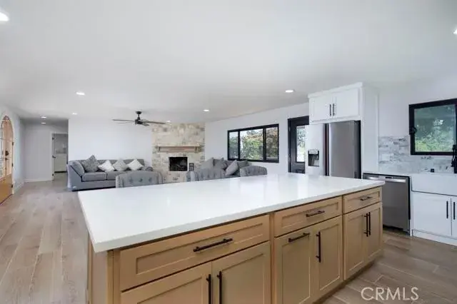 The spacious living room and oversized chef’s kitchen flow seamlessly together, anchored by a massive island and custom cabinetry. Designed for both entertaining and everyday comfort, this open-concept layout makes a statement the moment you walk in.