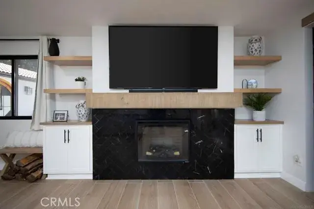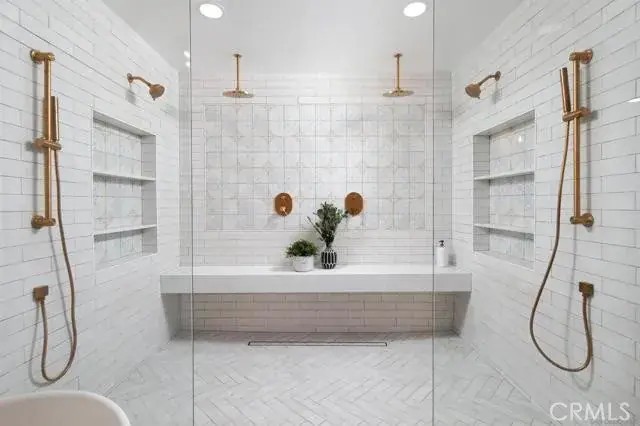 The primary suite offers a private retreat with custom tilework, electric fireplace, walk-in closet, soaking tub, and dual-head shower with built-in sound system.