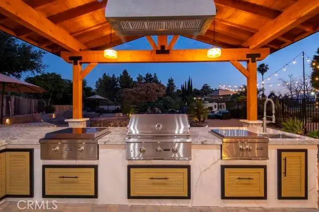 Designed for indoor-outdoor living, the backyard includes a covered patio wired for television and sound, a saltwater pool, a built-in grill, a fire pit, and a putting green. The expansive lot provides space and flexibility for a variety of uses.