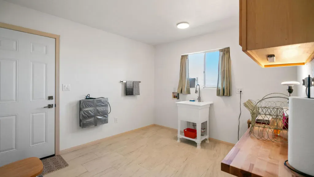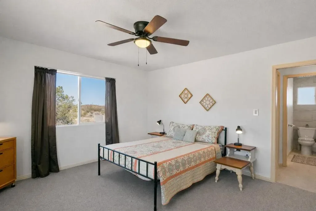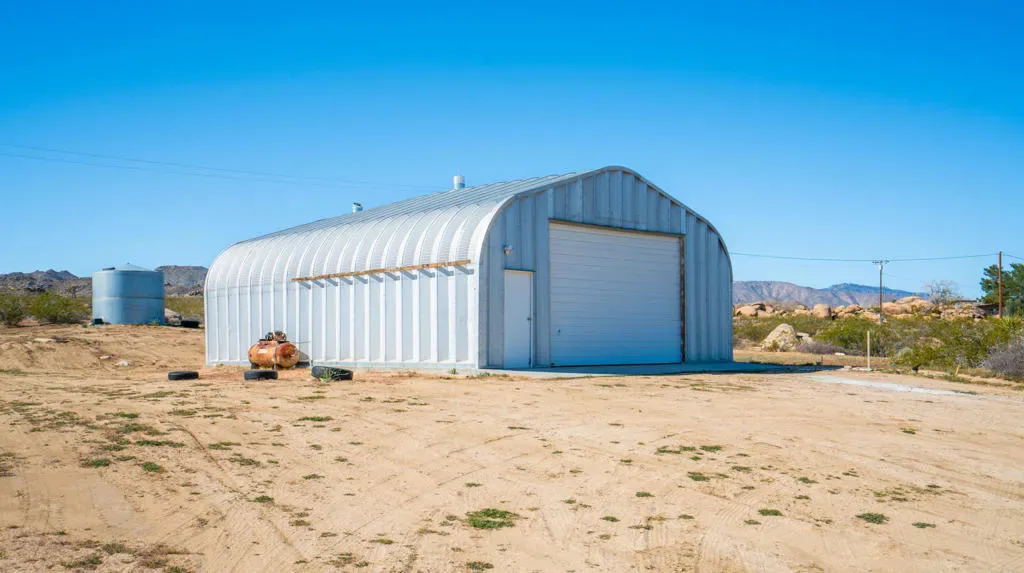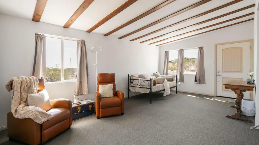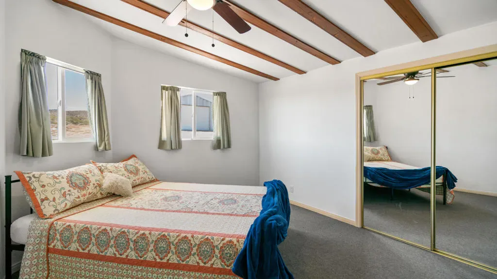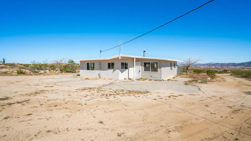 Huge Price Drop- Seller is extremely motivated! Seeking peace, solitude, and breathtaking desert views? This beautifully remodeled 2-bedroom, 1-bath home sits on 5 acres, has a large 6 car shop and offers the perfect balance of comfort and functionality. Ideal for off-road enthusiasts, outdoor adventurers, or anyone seeking wide-open space and tranquility, this unique desert retreat provides the ultimate blend of privacy and desert living. If adventure, privacy, and the serenity of the wide-open desert appeal to you, this property is the perfect fit.The interior has been thoughtfully updated throughout and features beautiful wood beamed ceilings, two bedrooms, a full bathroom with dual vanity, and a spacious mudroom/laundry room with utility sink. The kitchen has been refreshed with new countertops, sink, faucet, dishwasher, refrigerator, recessed lighting, and updated fixtures, while tile flooring, new carpet, upgraded windows, ceiling fans, fresh drywall, and interior paint give the home a clean, modern feel.For those who need space for equipment, vehicles, or toys, the property truly shines. A massive 30′ x 40′ six-car steel garage/workshop featuring a 12-14 ft roll-up door, reinforced concrete slab, and 220-volt power offers exceptional space for multiple vehicles, RVs, off-road rigs, trailers, tools, or heavy equipment. With easy access to surrounding desert terrain, this is an incredible setup for off-road recreation, including nearby King of the Hammers and other desert events. The spacious garage offers excellent potential for conversion into a large Additional Dwelling Unit (ADU), providing opportunities for guest accommodations, rental income, or extended living space if that suites your fancy.Additional improvements include new exterior siding and paint, security screen doors, porch lighting with sensors, upgraded windows, swamp cooler, industrial 45-gallon water heater with new housing, and improved water lines connecting the 5,000-gallon above-ground water tank to the pump house.Five usable acres, sweeping desert views, a large garage built for adventure, this property is ideal as a private getaway, vacation home, or short-term rental for desert enthusiasts looking to explore everything the High Desert has to offer.Buyer to verify all information to their satisfaction including, but not limited to, square footage, lot size, zoning, permits, utilities, water source, property boundaries, etc.