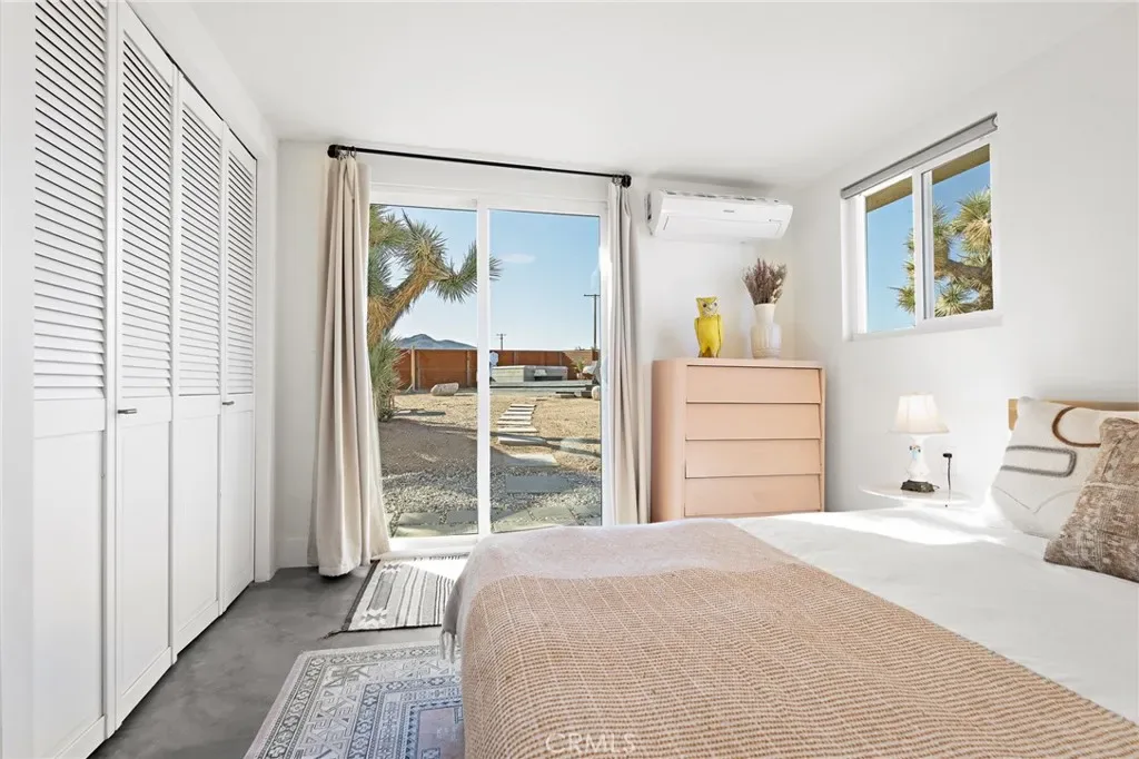 The 2-bedroom, 1-bath home features an open-concept layout with seamless flow between the living, dining, and kitchen areas. Polished concrete floors run throughout, creating a clean, modern desert aesthetic. The dining space is anchored by a statement Malm fireplace, adding warmth and architectural character. The kitchen includes a Bertazzoni induction range, blending high-end performance with modern design. Mini-split systems throughout the home provide efficient heating and cooling year-round and stacked washer and dryer.