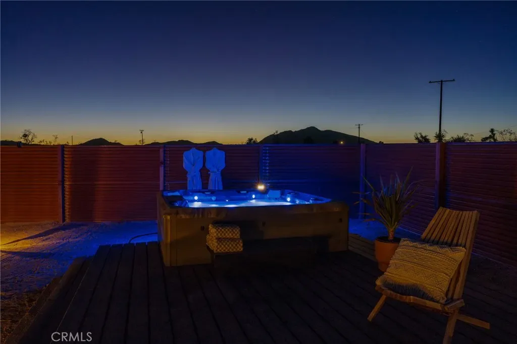 The shaded front porch offers comfortable outdoor living during the summer months. In the rear, an oversized deck with a large hot tub captures expansive 360-degree desert and National Park views. The privacy of the acreage combined with Joshua Tree’s dark skies makes this an ideal setting for stargazing, entertaining, and quiet desert living.