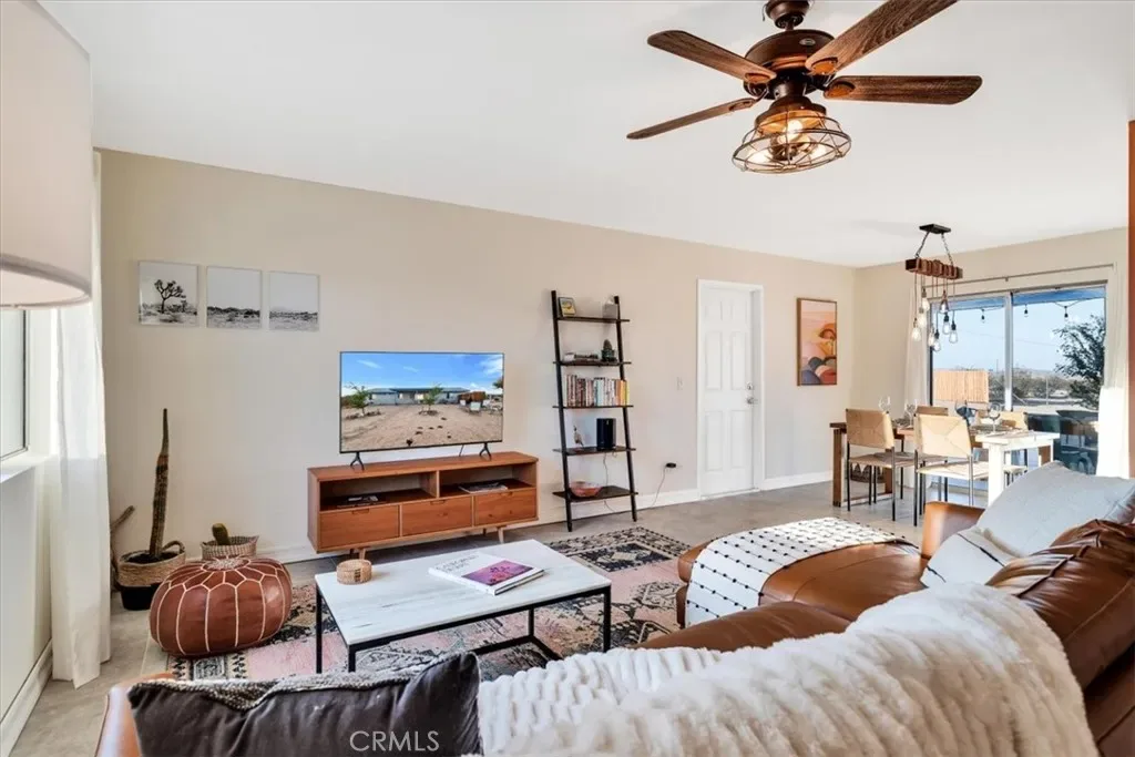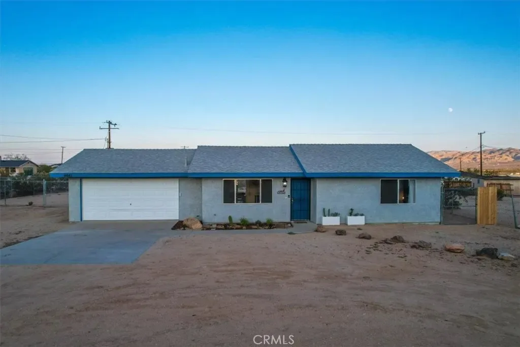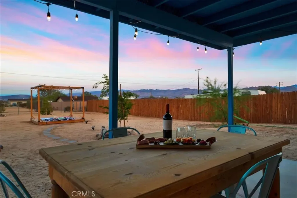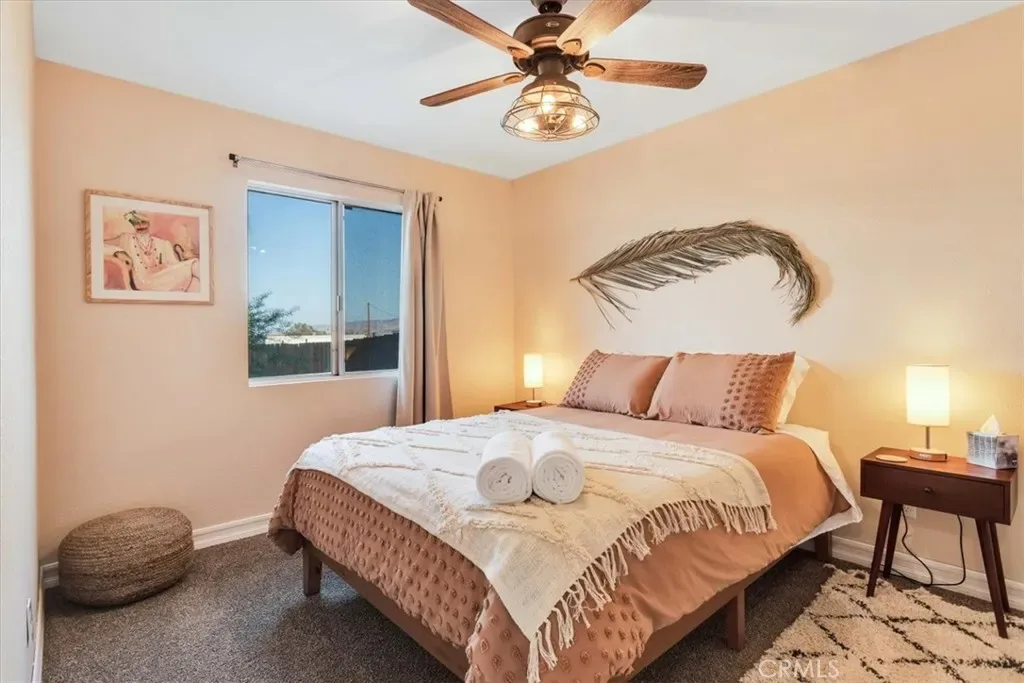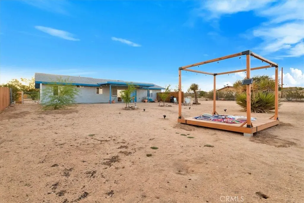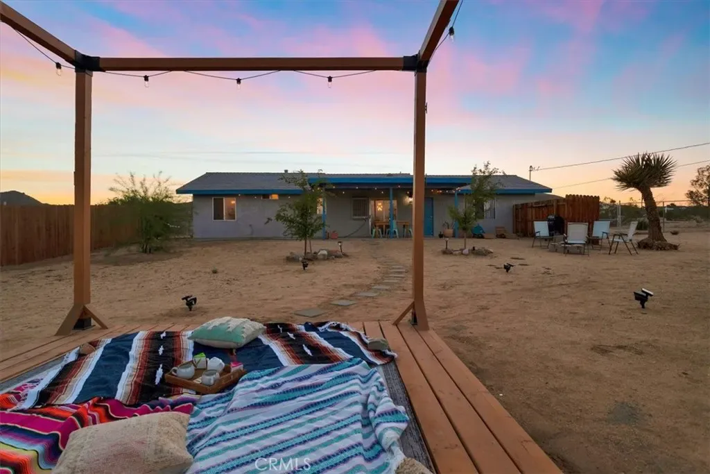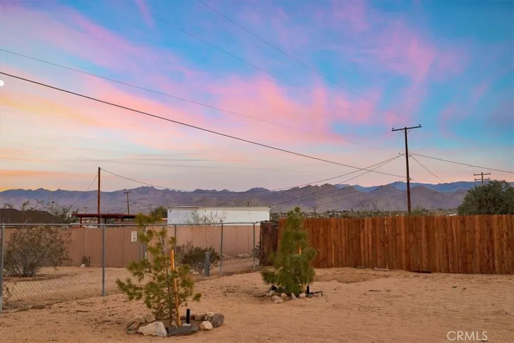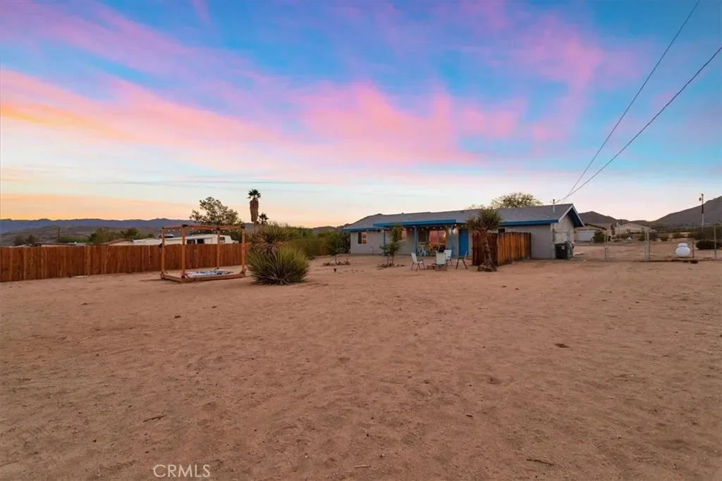 Located in the Hidden Rivers area of Joshua Tree, this inviting 2 bedroom, 1 bath home sits on just under half an acre and offers comfort, light-filled living, and a thoughtfully designed outdoor space. The spacious main living area features tile flooring, a ceiling fan, sliding glass doors, and plenty of natural light, creating an open and welcoming atmosphere. The kitchen provides ample cabinet and counter space, making meal prep easy and functional. Both bedrooms are generously sized and well lit, each with its own ceiling fan for added comfort. The bathroom includes a classic tub/shower combo. Step outside to a fenced backyard that’s ready for relaxing or entertaining. A covered back patio offers shaded seating, while chain link and privacy fencing create a secure environment. The yard also features a fire pit, a sunbathing platform, and plenty of open space to enjoy the desert lifestyle. All this, plus it’s only minutes from all the amenities of Joshua Tree Village and the entrance to the national park? Wow! With its convenient Hidden Rivers location and comfortable layout, this home is a great opportunity to experience Joshua Tree living.