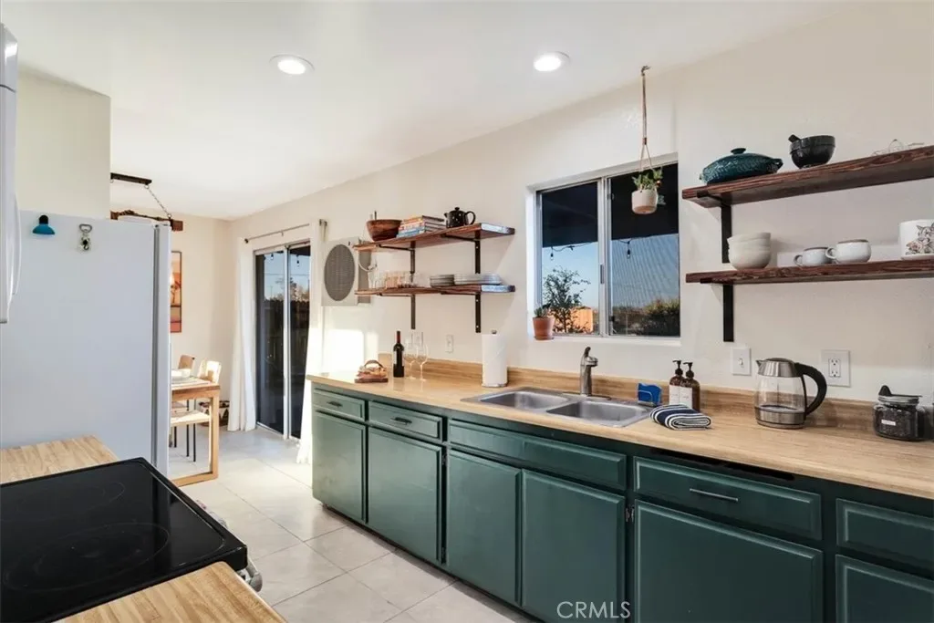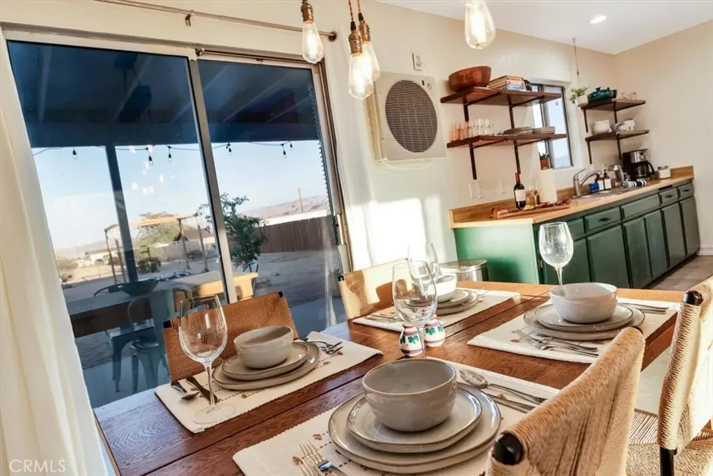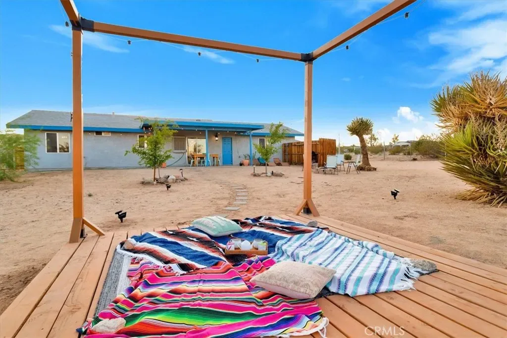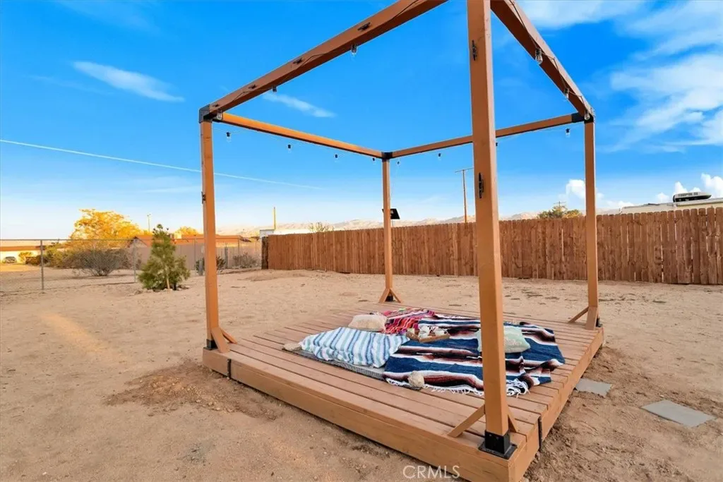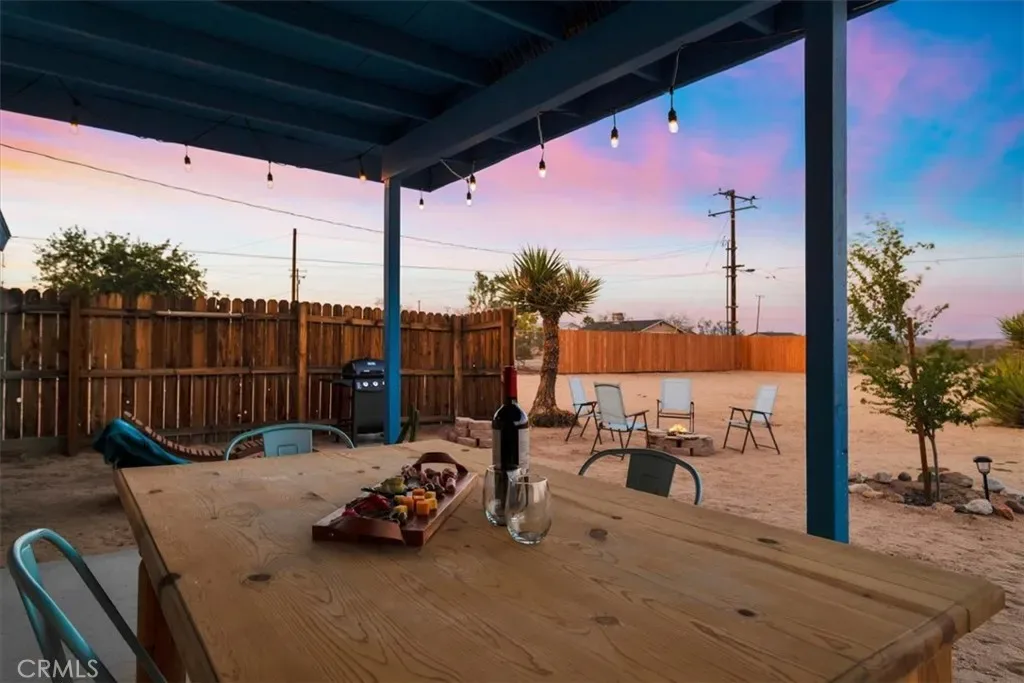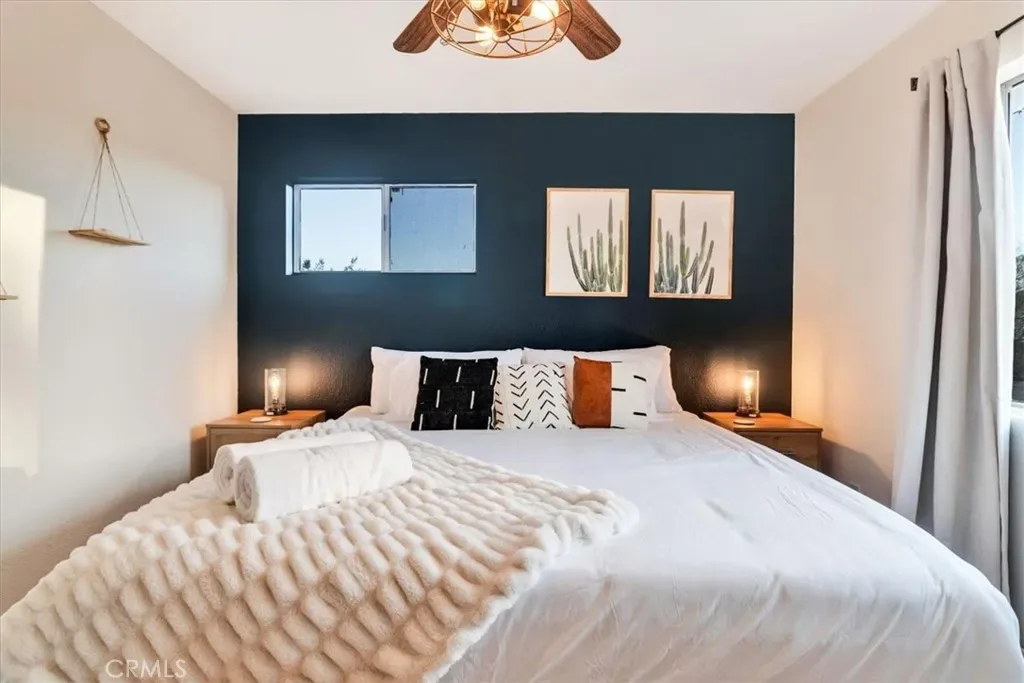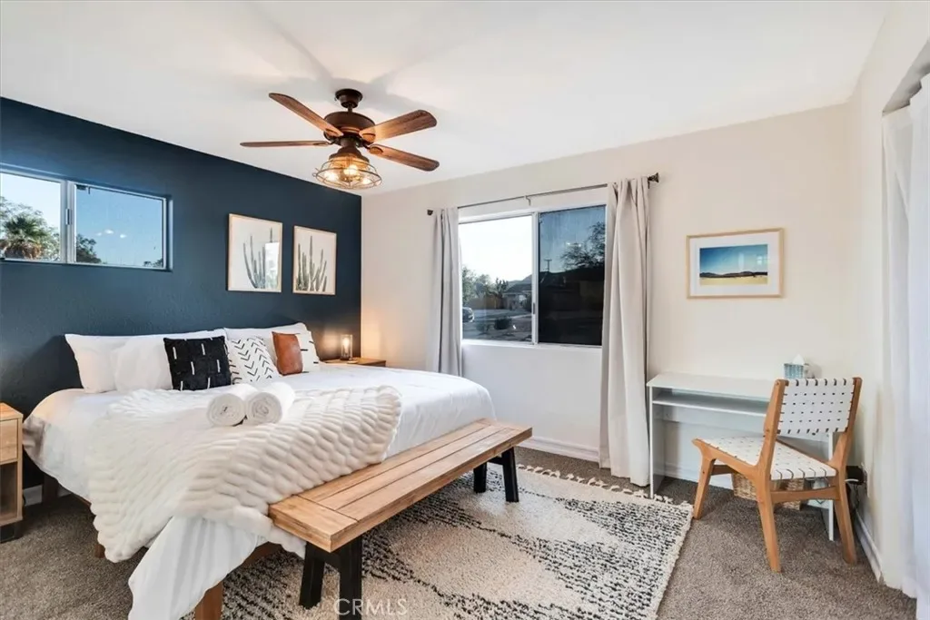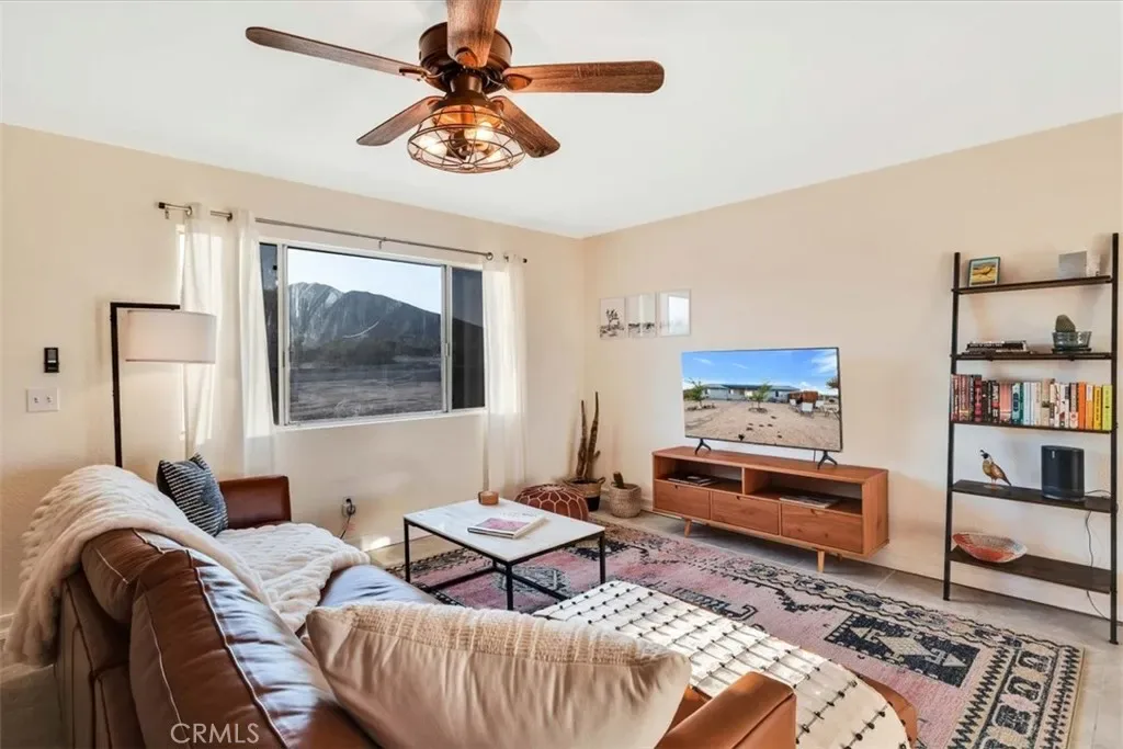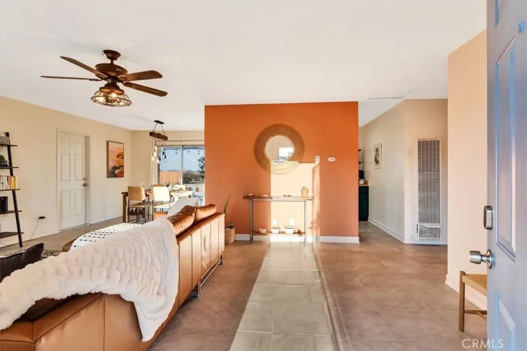 Located in the Hidden Rivers area of Joshua Tree, this inviting 2 bedroom, 1 bath home sits on just under half an acre and offers comfort, light-filled living, and a thoughtfully designed outdoor space. The spacious main living area features tile flooring, a ceiling fan, sliding glass doors, and plenty of natural light, creating an open and welcoming atmosphere. The kitchen provides ample cabinet and counter space, making meal prep easy and functional. Both bedrooms are generously sized and well lit, each with its own ceiling fan for added comfort. The bathroom includes a classic tub/shower combo. Step outside to a fenced backyard that’s ready for relaxing or entertaining. A covered back patio offers shaded seating, while chain link and privacy fencing create a secure environment. The yard also features a fire pit, a sunbathing platform, and plenty of open space to enjoy the desert lifestyle. All this, plus it’s only minutes from all the amenities of Joshua Tree Village and the entrance to the national park? Wow! With its convenient Hidden Rivers location and comfortable layout, this home is a great opportunity to experience Joshua Tree living.