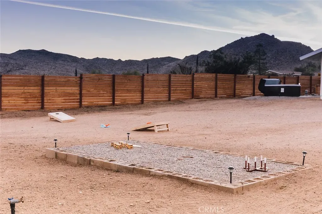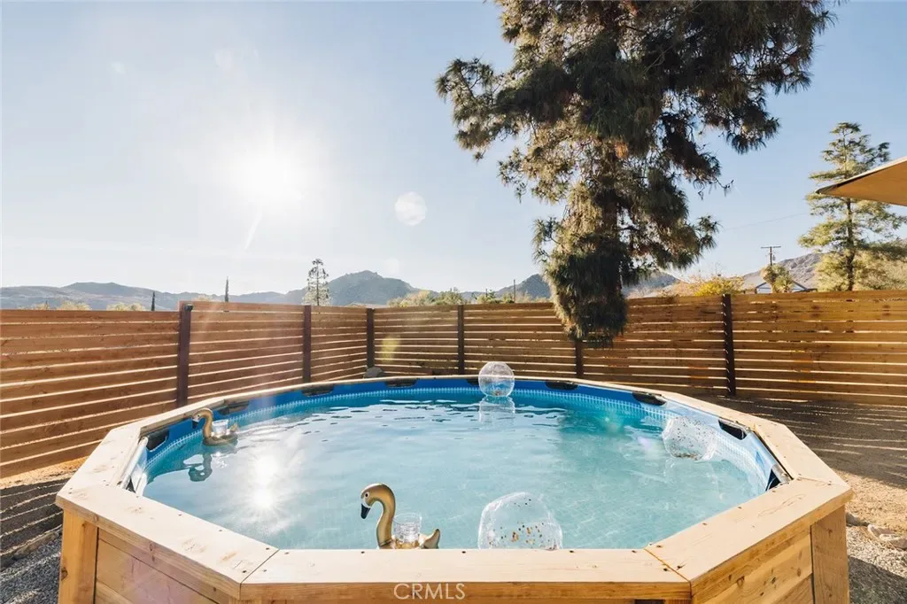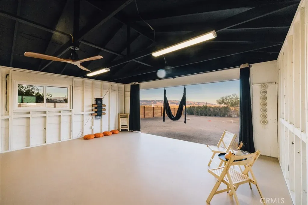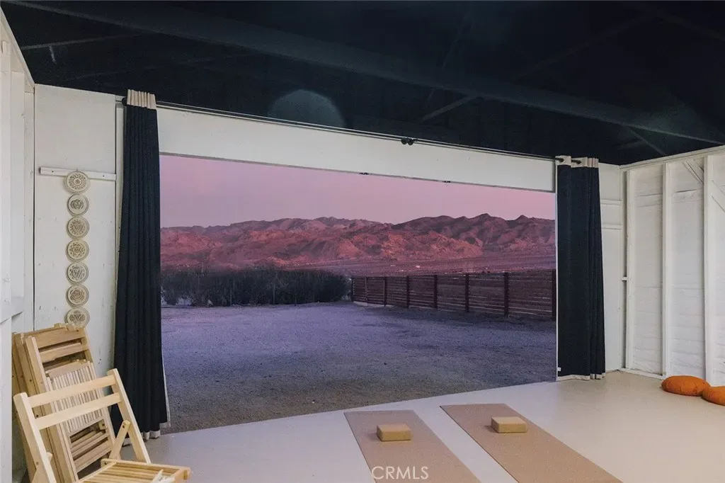 Perched atop a hill on a sprawling 19,425 sq. ft. corner lot, this retreat boasts breathtaking 180-degree desert views—the perfect backdrop for relaxation and entertainment. The backyard is a private sanctuary, designed for unforgettable experiences under the iconic Joshua Tree night sky. Enjoy an above-ground pool, hot tub, fire pit, and a row of hammocks—perfect for unwinding. The dedicated yoga studio and meditation room elevate this home into a true wellness retreat. An outdoor shower adds convenience after a day of hiking or lounging in the pool.
