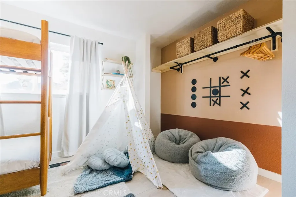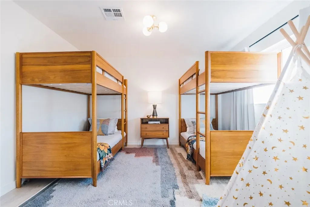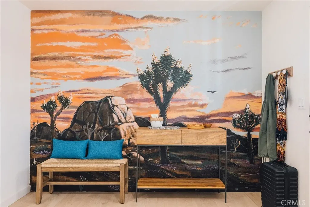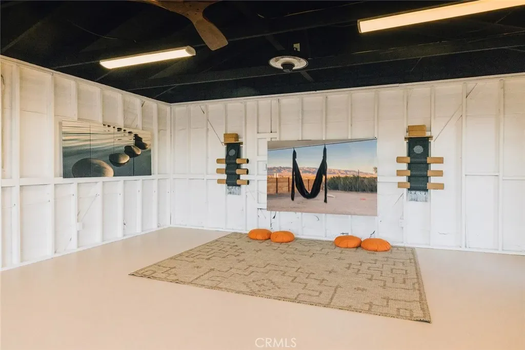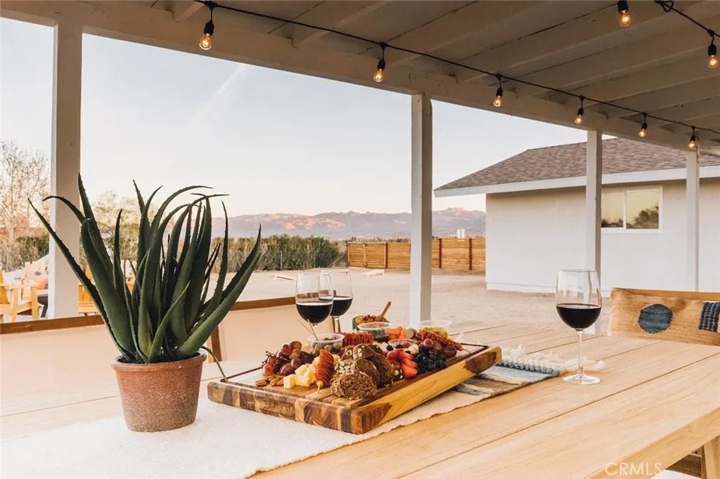Perched atop a hill on a sprawling 19,425 sq. ft. corner lot, this retreat boasts breathtaking 180-degree desert views—the perfect backdrop for relaxation and entertainment. The backyard is a private sanctuary, designed for unforgettable experiences under the iconic Joshua Tree night sky. Enjoy an above-ground pool, hot tub, fire pit, and a row of hammocks—perfect for unwinding. The dedicated yoga studio and meditation room elevate this home into a true wellness retreat. An outdoor shower adds convenience after a day of hiking or lounging in the pool.