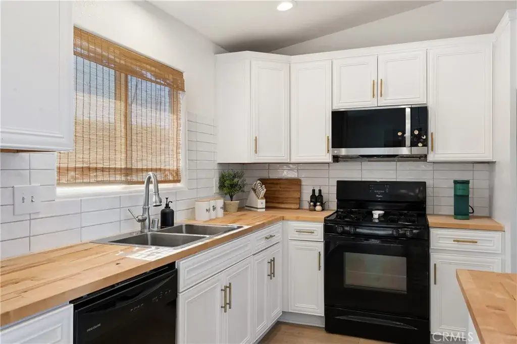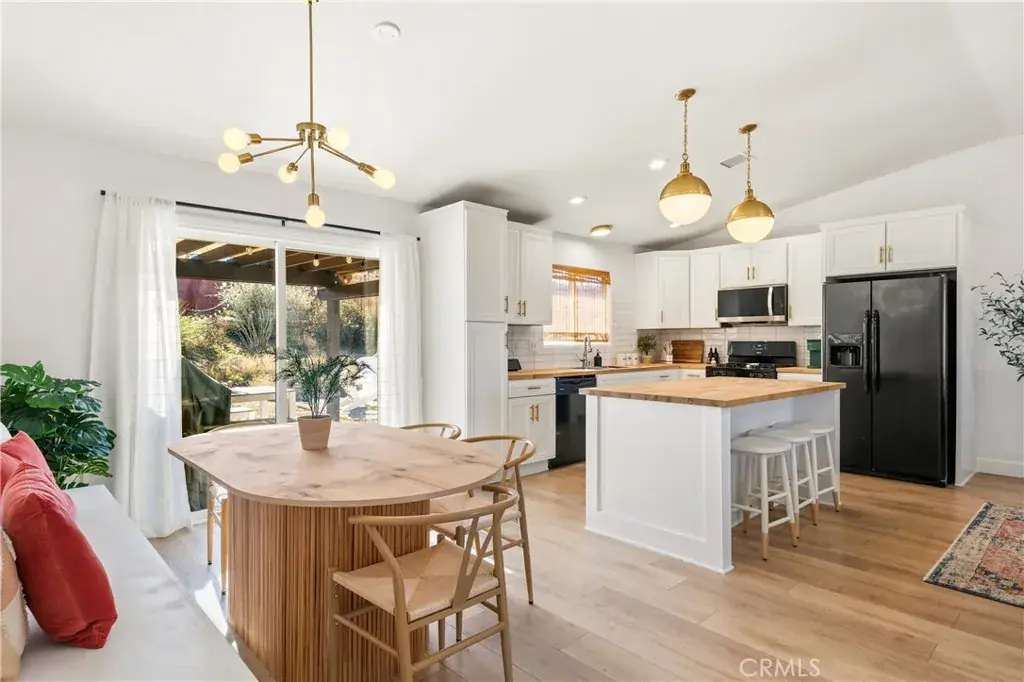 A paved driveway leads to a 2-car garage, charming brick-accented façade, and inviting covered front porch. Inside, the open-concept living space features vaulted ceilings, abundant natural light, and a cozy gas fireplace. The dining area opens to the backyard, ideal for entertaining, while the airy kitchen offers butcher block countertops, ample cabinetry, and a gas range.