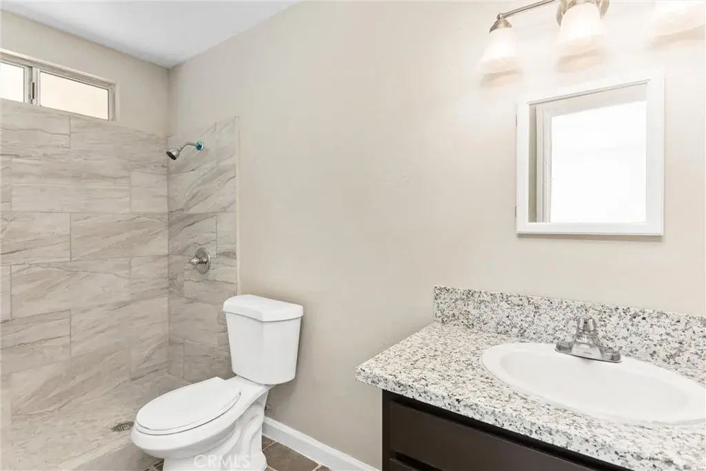 Just off the kitchen is the first of two spacious en-suite bedrooms, complete with a ceiling fan and an updated bathroom featuring a tiled walk-in shower, plus a convenient laundry area with extra storage. On the opposite side of the home, you’ll find three additional bedrooms, two of which offer ceiling fans, recessed lighting, and generous space. These bedrooms share a centrally located full bathroom with a shower/tub combination. The second en-suite bedroom includes its own updated bath with a tiled walk-in shower, granite vanity, and modern finishes.